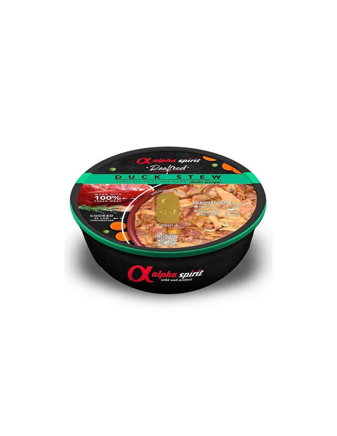 L’Estofat d’Ànec Alpha Spirit Realfood és un aliment humit complet per a gossos, preparat amb ingredients naturals i una cocció suau que conserva la sucositat i el sabor autèntic de l’ànec fresc. La seva textura tendra i el seu aroma intens el converteixen en una opció ideal per a gossos amb bon apetit o per a aquells que necessiten un extra de motivació en els seus àpats.