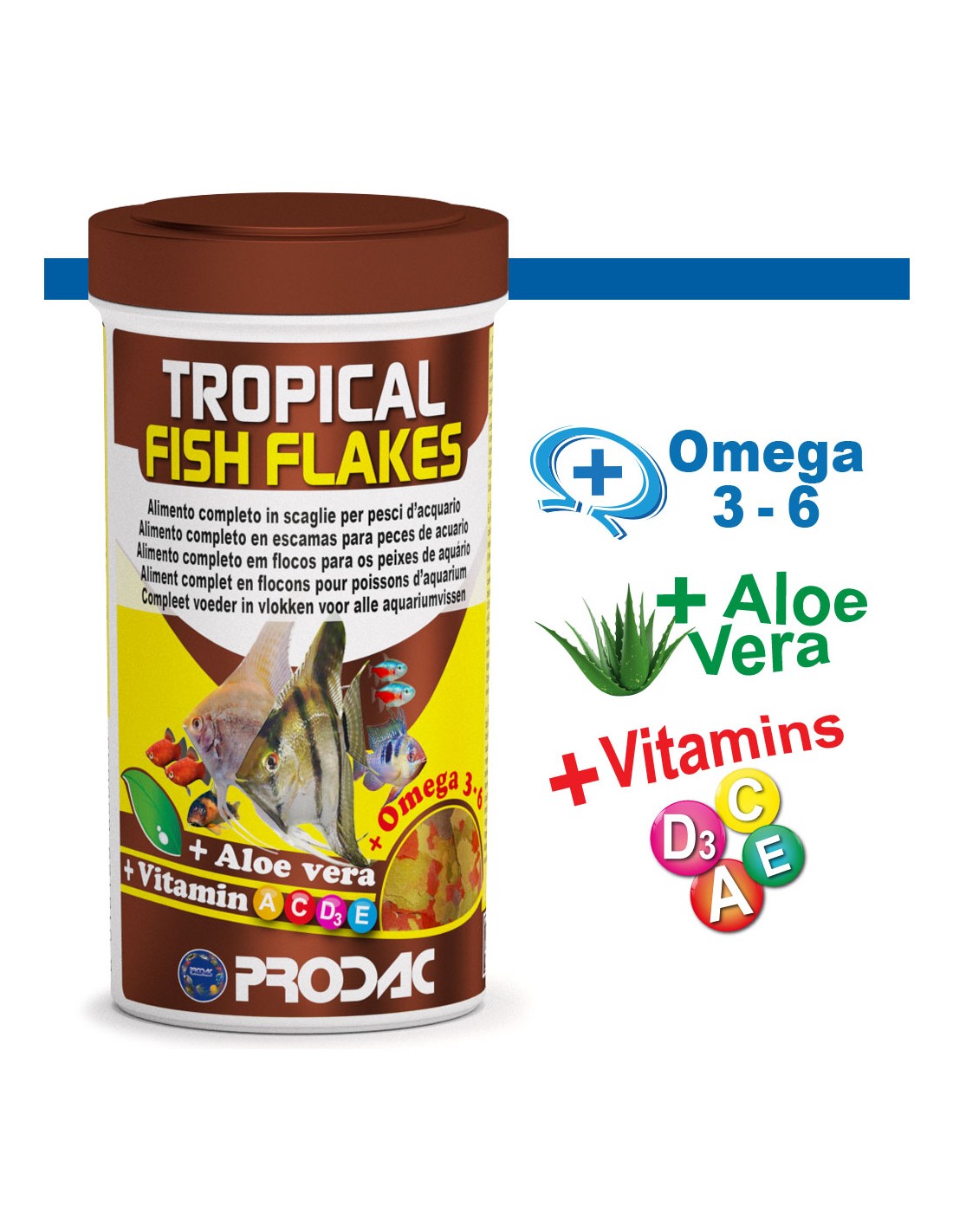 Aliment compost en escames per a tots els peixos tropicals d'aquari. La mescla de diverses farines d'òptima qualitat és la base d'aquest aliment especial del qual els peixos tropicals necessiten quotidianament per al seu creixement i manteniment.