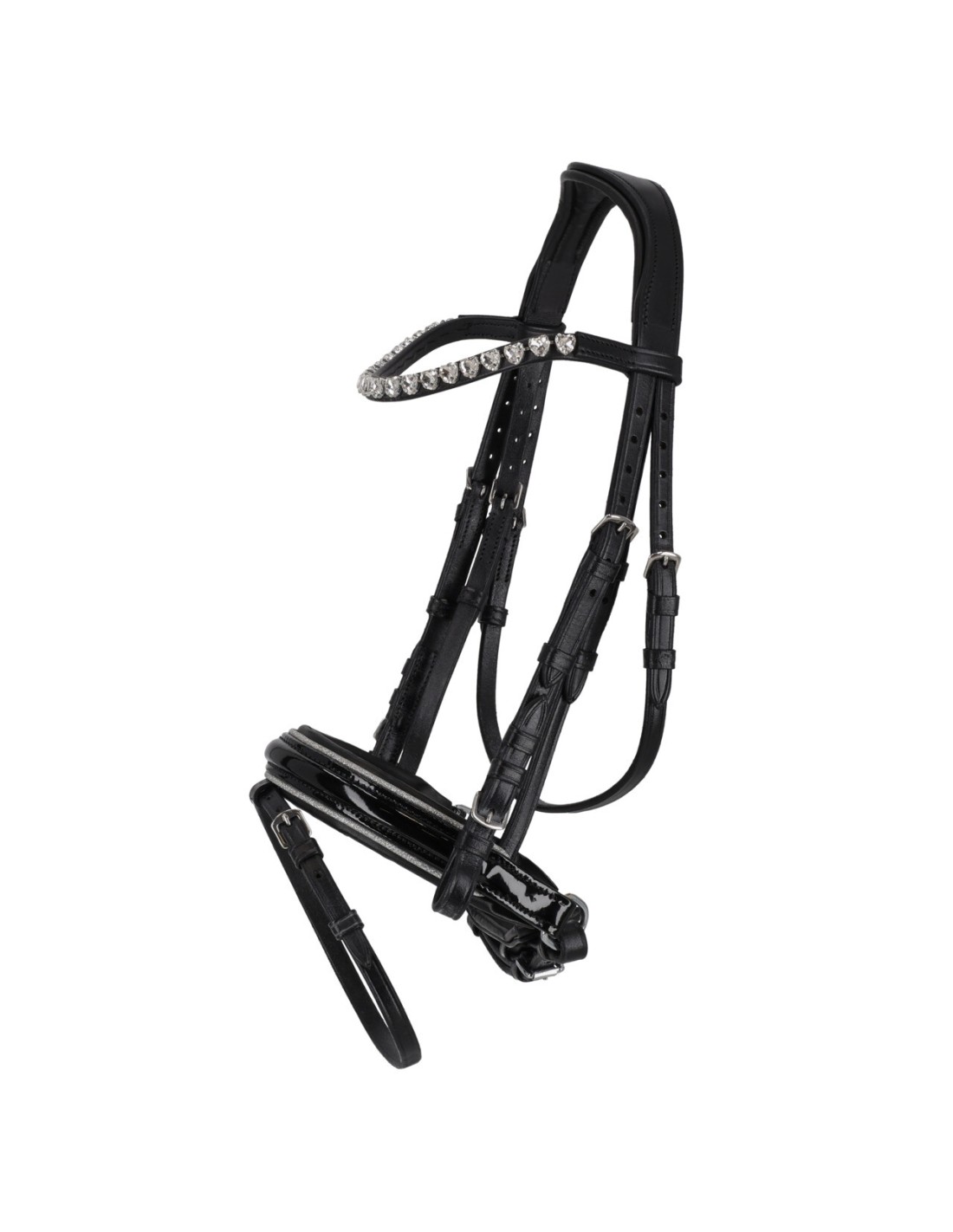 Brida de cuir negre amb muserola de xarol i vora brillant.