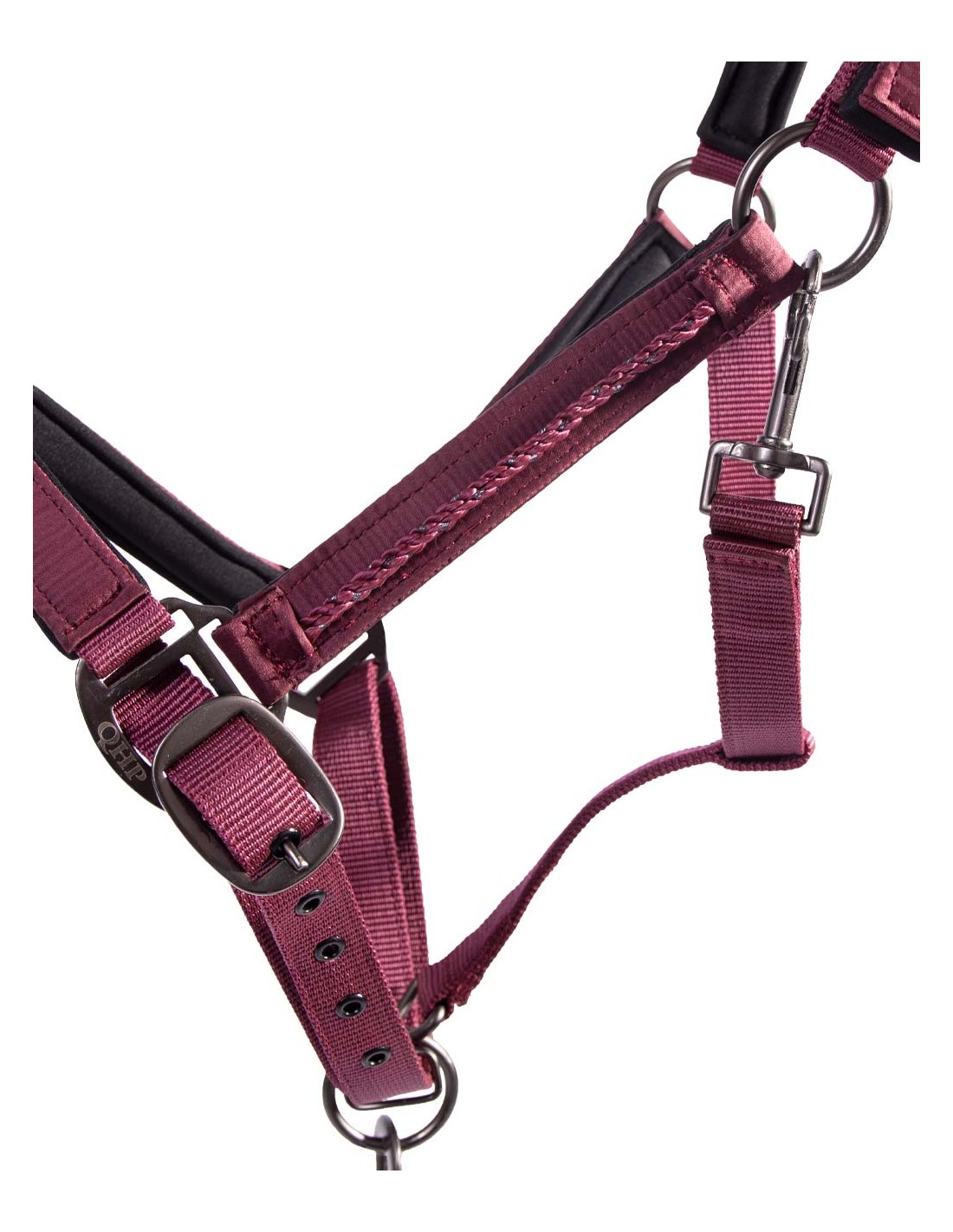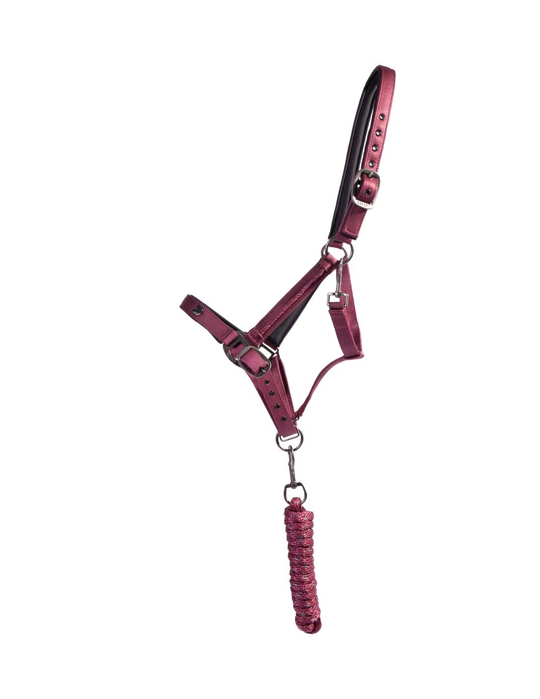 Material: polipropilè i polièster.Sivelles: RVSAmb folre suau en la testera, les galtes i la muserola.Muserola i testera ajustables.Amb tancament de mosquetó en la gola.Corda a joc amb mosquetó.