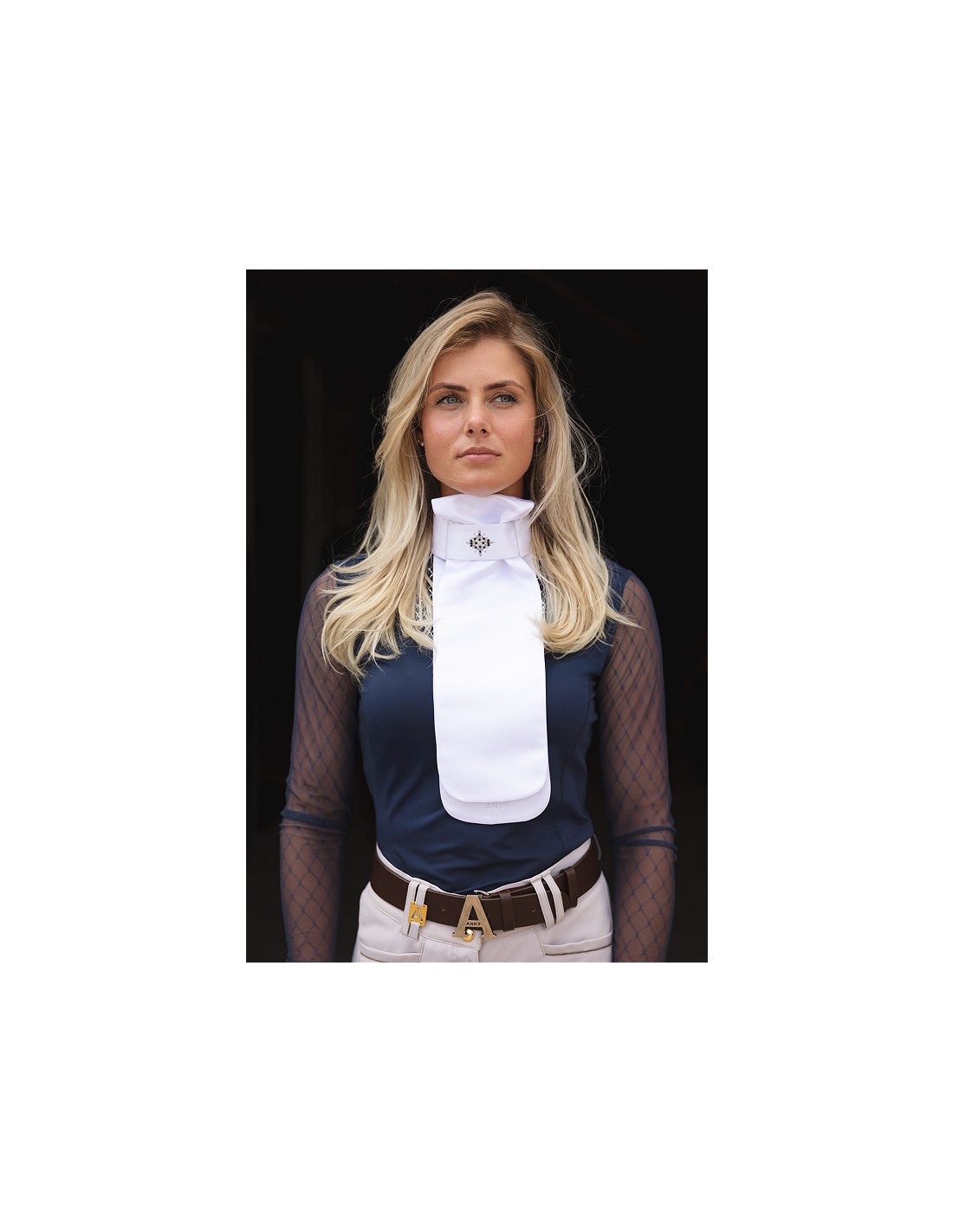 L'elegant patró gràfic de diamants d'imitació conté diamants d'imitació de diferents grandàries i colors a joc. El coll també conté diamants d'imitació i està rematat amb un subtil rivet. La solapa llarga i solta és ajustable i es pot portar tan alta com baixa.