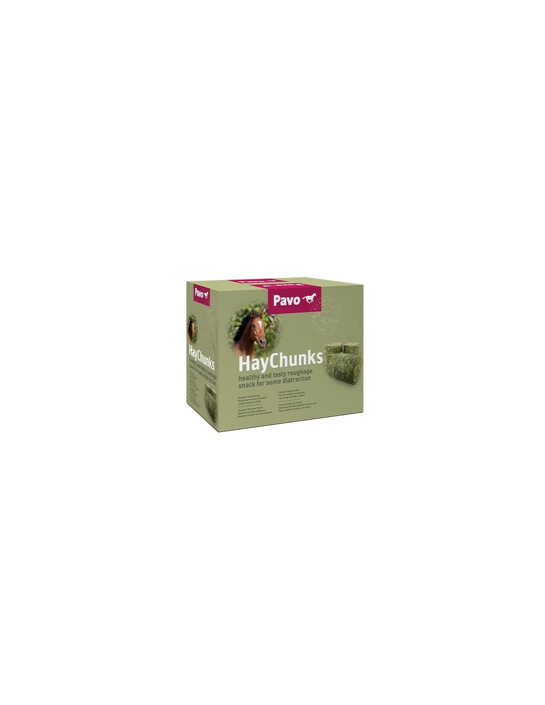 Pavo HayChunks és ideal per subministrar de forma addicional al farratge, com un snack o recompensa saludable després del treball, o per proporcionar una distracció addicional. Els HayChunks (porcions) són cilindres comprimits, de la mida d'una llauna de refresc, i estan fets de fenc d'herba. Aquest fenc d'herba procedeix d'Alemanya i es cull en uns prats muntanyosos. Això vol dir que és fenc ecològic, es cull de pastures no fertilitzades, és d'una qualitat constant i té un baix nivell nutricional, per la qual cosa HayChunks és segur per a tota classe de cavalls i ponis, inclosos cavalls sensibles al sucre o propensos a l'obesitat, però que necessiten una aportació de fibra extra i entreteniment.