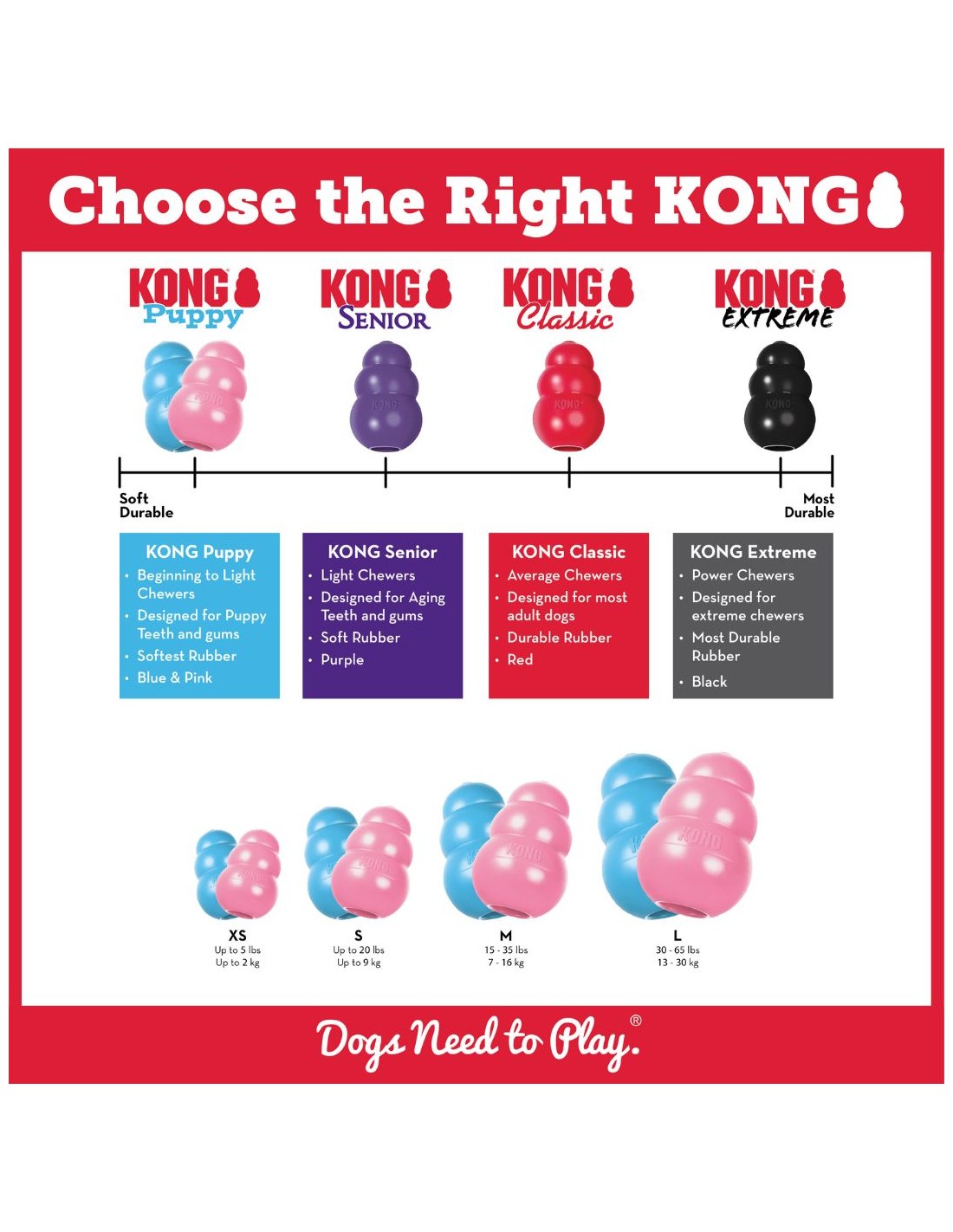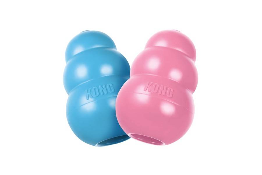 La joguina per a gossos Puppy KONG està adaptat per a les dents de llet d'un cadell que està creixent; la seva exclusiva fórmula de cautxú completament natural és la més suau de la línia de joguines de cautxú KONG. Dissenyat per a satisfer les necessitats de les 28 dents de llet d'un cadell, contribueix a l'aprenentatge de comportaments de masticació apropiats alhora que aporta beneficis i satisfà les necessitats instintives dels cadells més petits. Els seus rebots erràtics ho converteixen en la joguina ideal per a aquests cadells que només volen jugar. Empleni-ho amb aliment balancejat per a cadells o aliment humit.