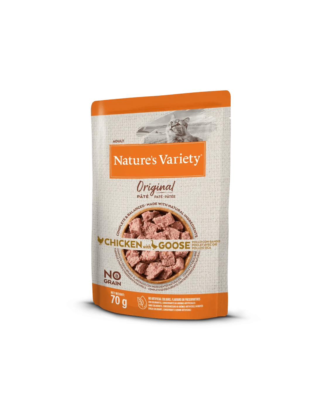 Aliment complet i equilibrat per a gats adults, sense cereals.