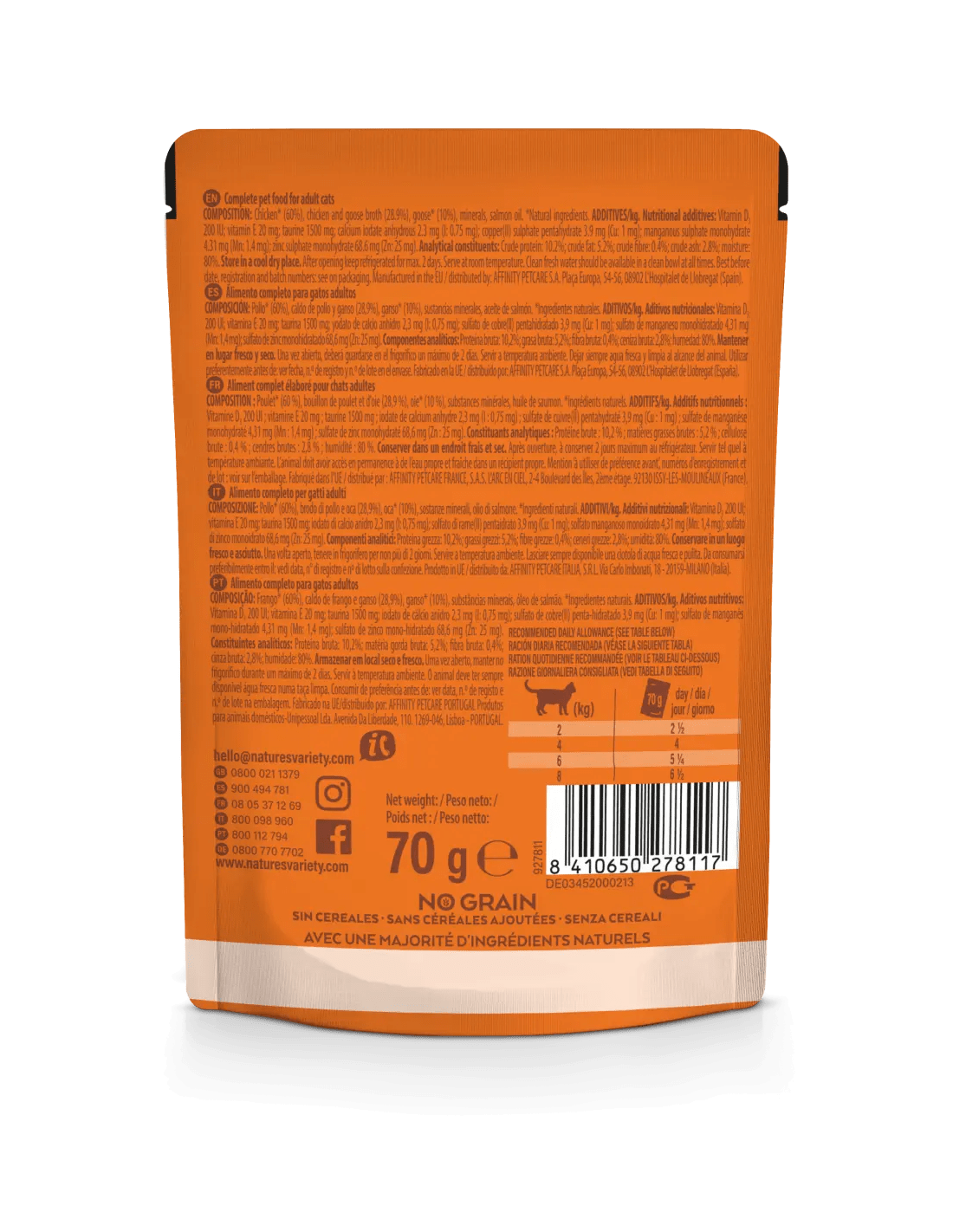 Amb pollastre i oca d'alta qualitat com a ingredient principal. Cuit a el vapor a temperatura òptima en els seus propis sucs per preservar millor els nutrients.