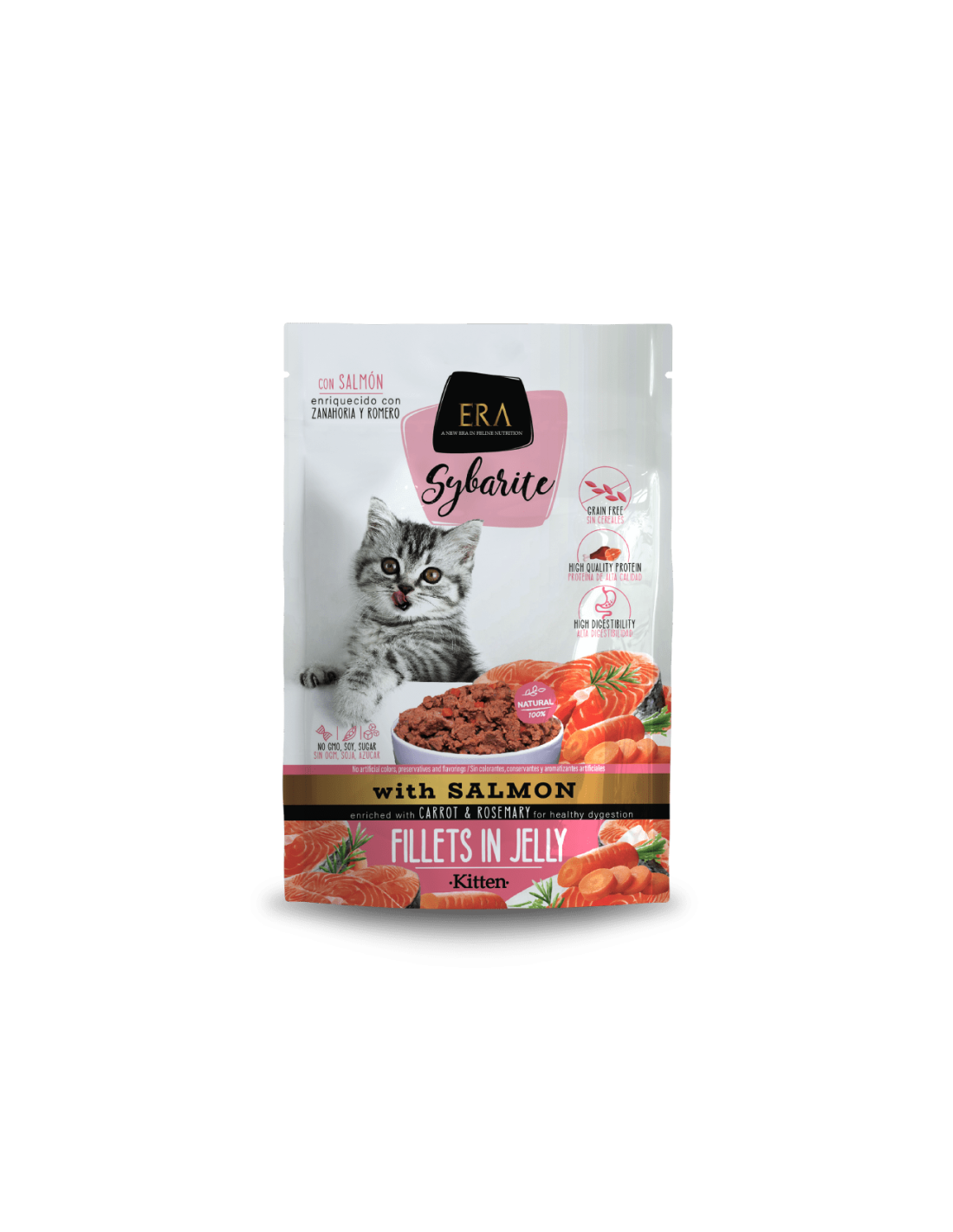 Alimento húmedo ERA Sybarite para gatitos de todo tipo de razas (recomendado desde el destete hasta los 6 meses). Con Salmón con Zanahoria y Romero en su receta y un 85% de carne fresca como primer ingrediente. Aporta ingredientes naturales, funcionales, deliciosos y aporta una gran hidratación. Recetas especialmente creadas para gatos exigentes.