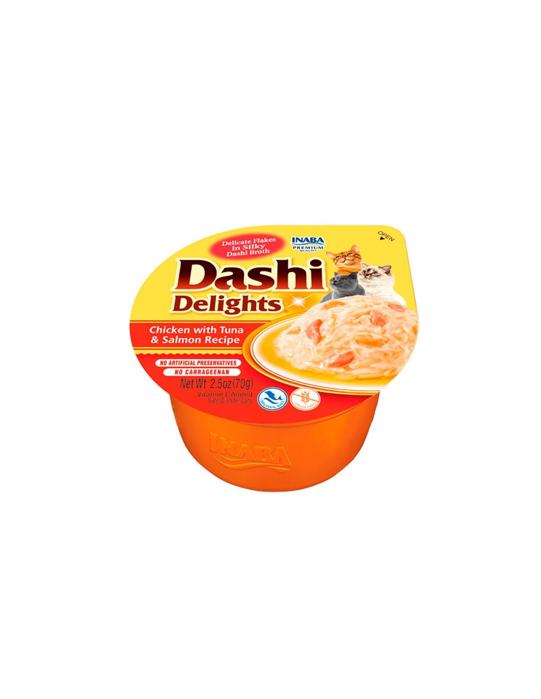 El dashi és un brou de peix tradicional japonès a base de "hojuelas" de tonyina llistada, famós pel seu ric i expressiu gust. És una menja única amb alta humitat, ric en proteïna animal, sense cereals, additius indesitjables i ingredients artificials. Dashi Delights Pollastre de INABA farà que cada menjar sigui deliciós excepcional.