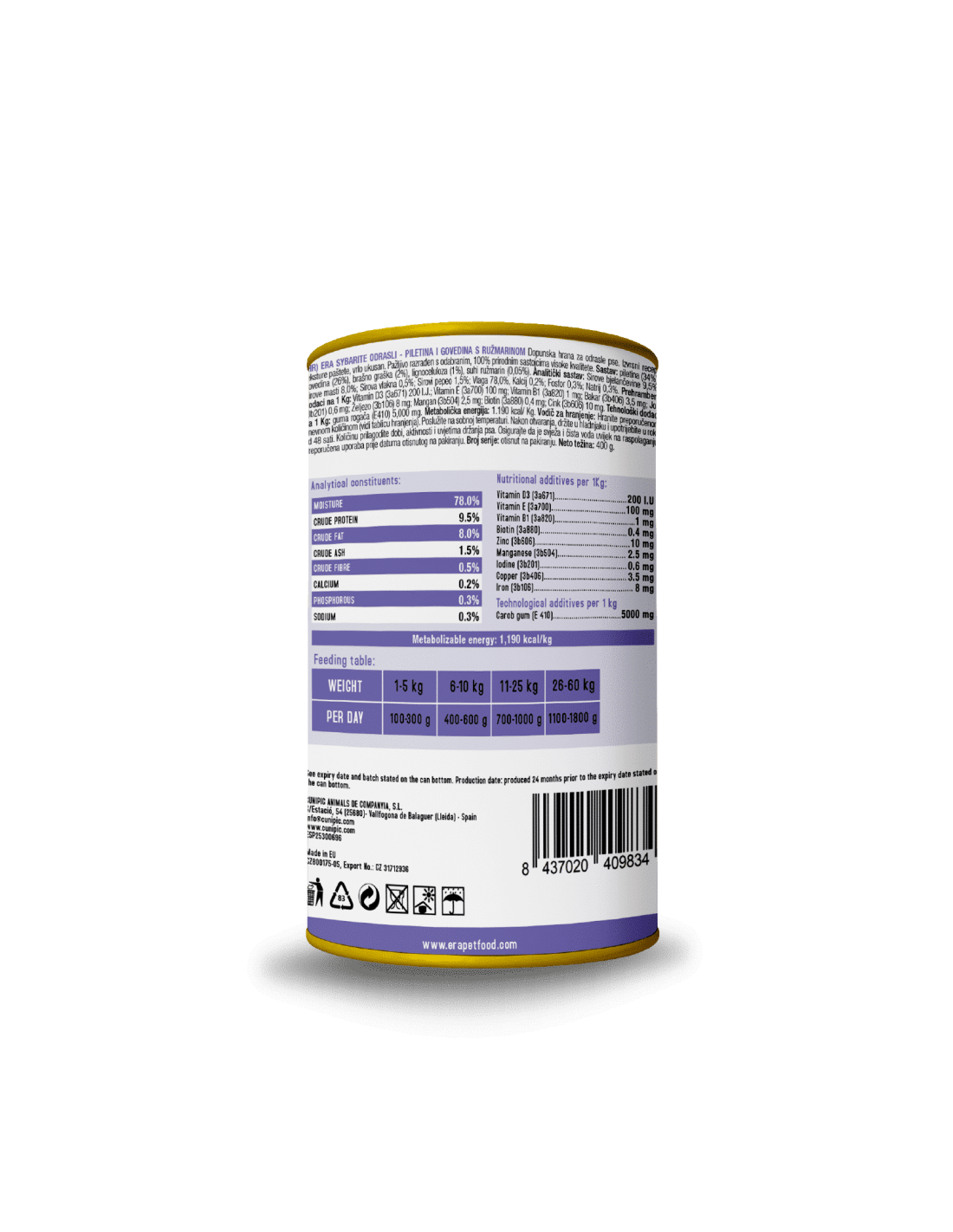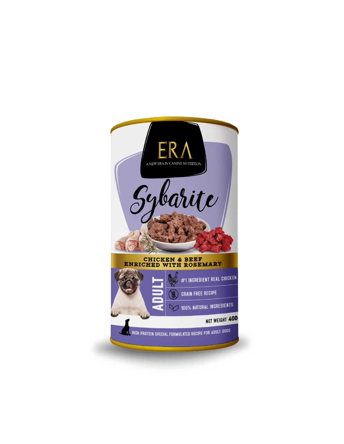 Alimento húmedo ERA Sybarite para perros adultos de todo tipo de razas. Con Pollo y Ternera en su receta y una exquisita textura en paté. Aporta ingredientes naturales, funcionales, deliciosos y una gran hidratación. Recetas especialmente creadas para perros exigentes.
