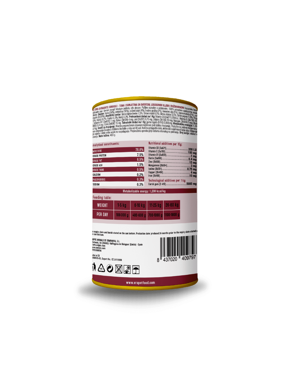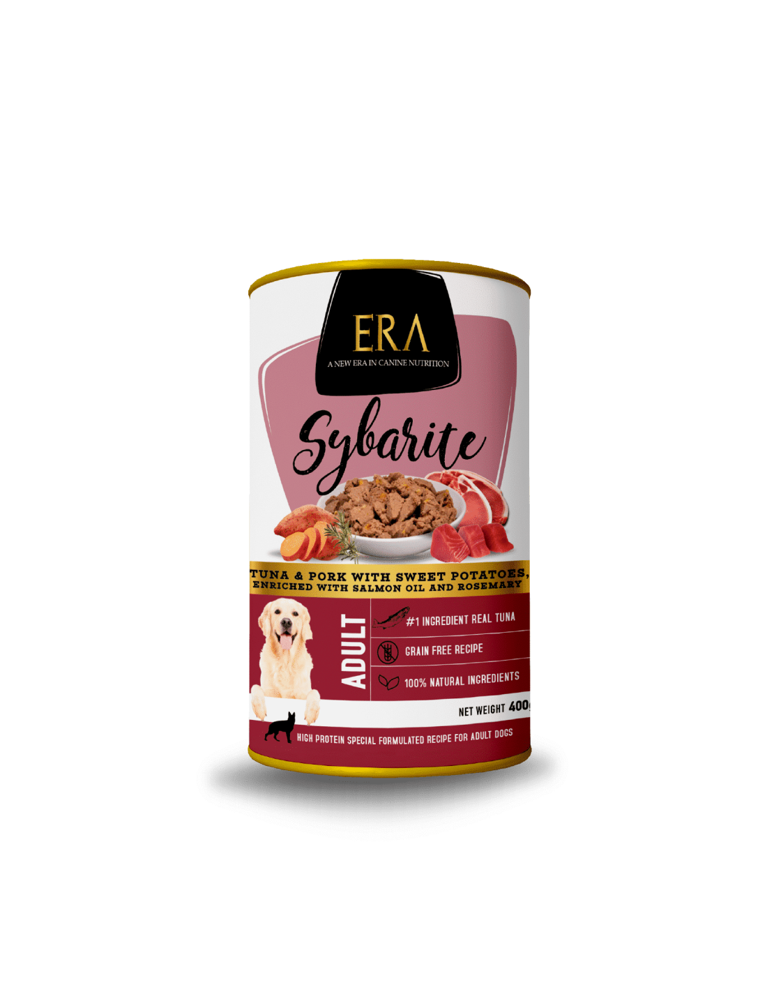 Alimento húmedo ERA Sybarite para perros adultos de todo tipo de razas. Con Atún y Cerdo en su receta y una exquisita textura en paté. Aporta ingredientes naturales, funcionales, deliciosos y una gran hidratación. Recetas especialmente creadas para perros exigentes.