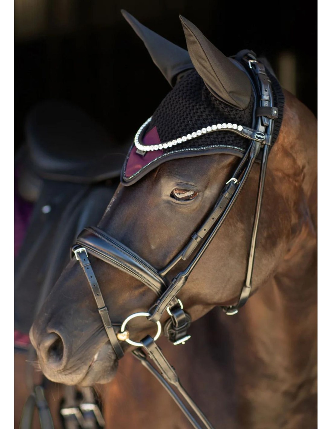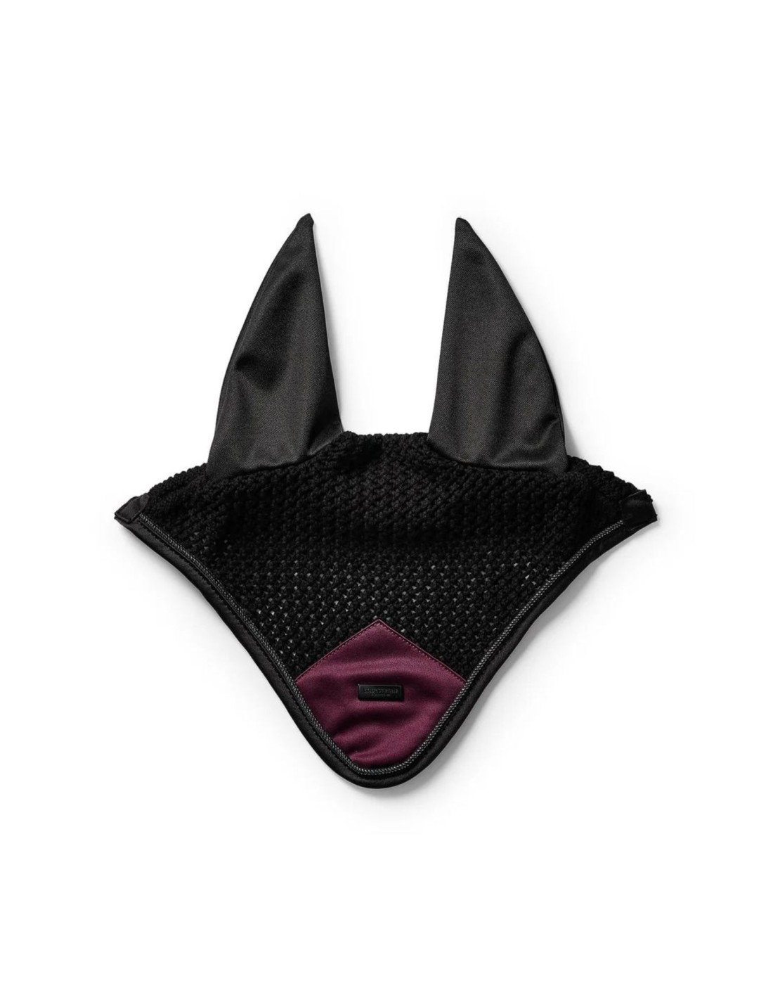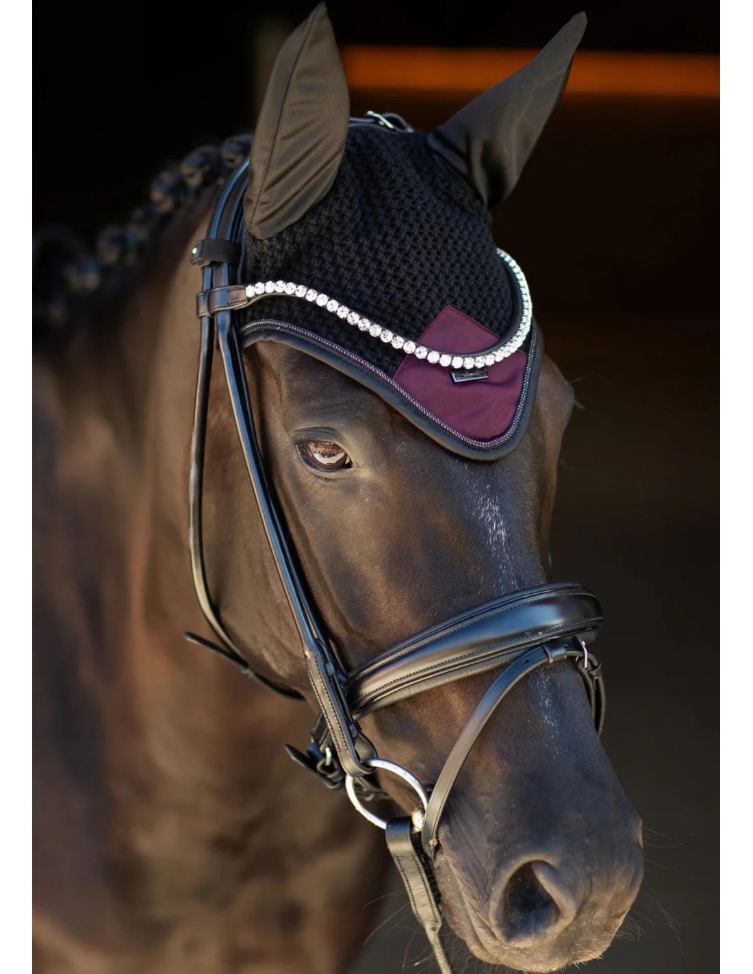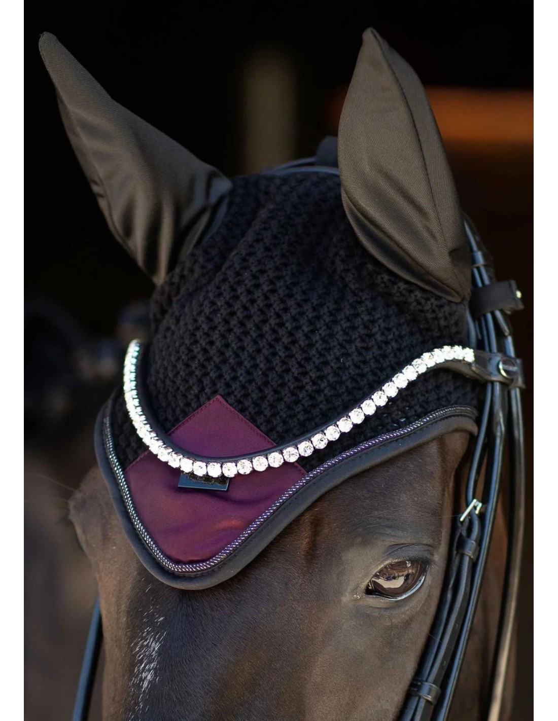 Orelleres teixides a crochet en color negre. Decorada amb un pegat de setí morat fosc en la part davantera, un bonic rivet platejat i una insígnia de Equestrian Stockholm en negre. La xarxa per a les orelles proporciona protecció contra els insectes i reducció del soroll. Té una tela elàstica en les orelles per a una major comoditat.