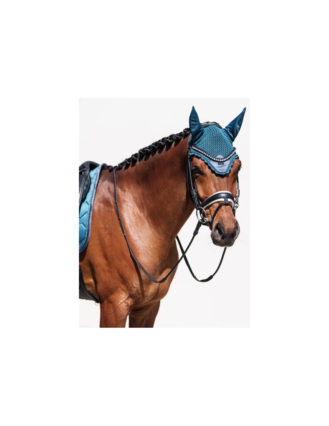Luxoses orelleres un elegant color blau verdós intens. Decorat amb un pegat de setí to sobre to en la part davantera, un preciós rivet blau verdós intens i una insígnia platejada de Equestrian Stockholm. Protegeix contra insectes i redueix el soroll. Compta amb un teixit elàstic en les orelles per a major comoditat.