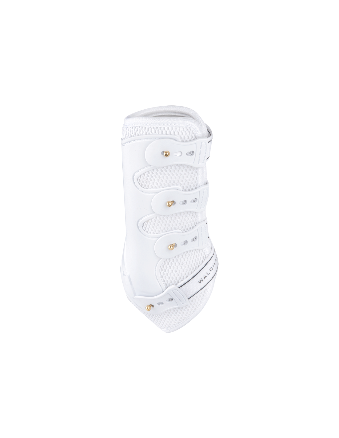 Absorbent de cops i particularment permeable a l'aire per un encoixinament de xarxa especial. Regulable en 3 posicions mitjançant pràctiques corretges elàstiques que s'ajusten perfectament a la pota del cavall. Set d'un parell.