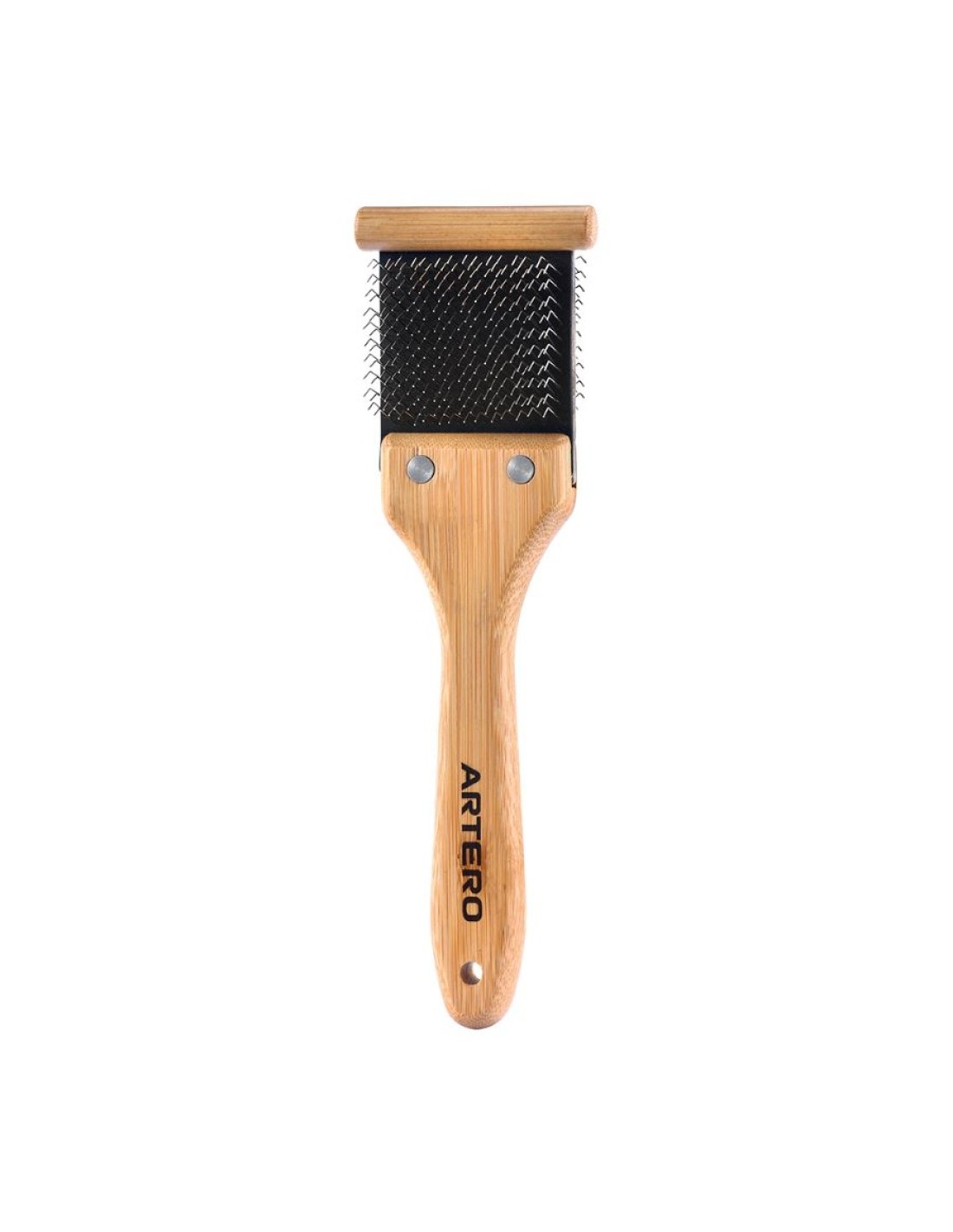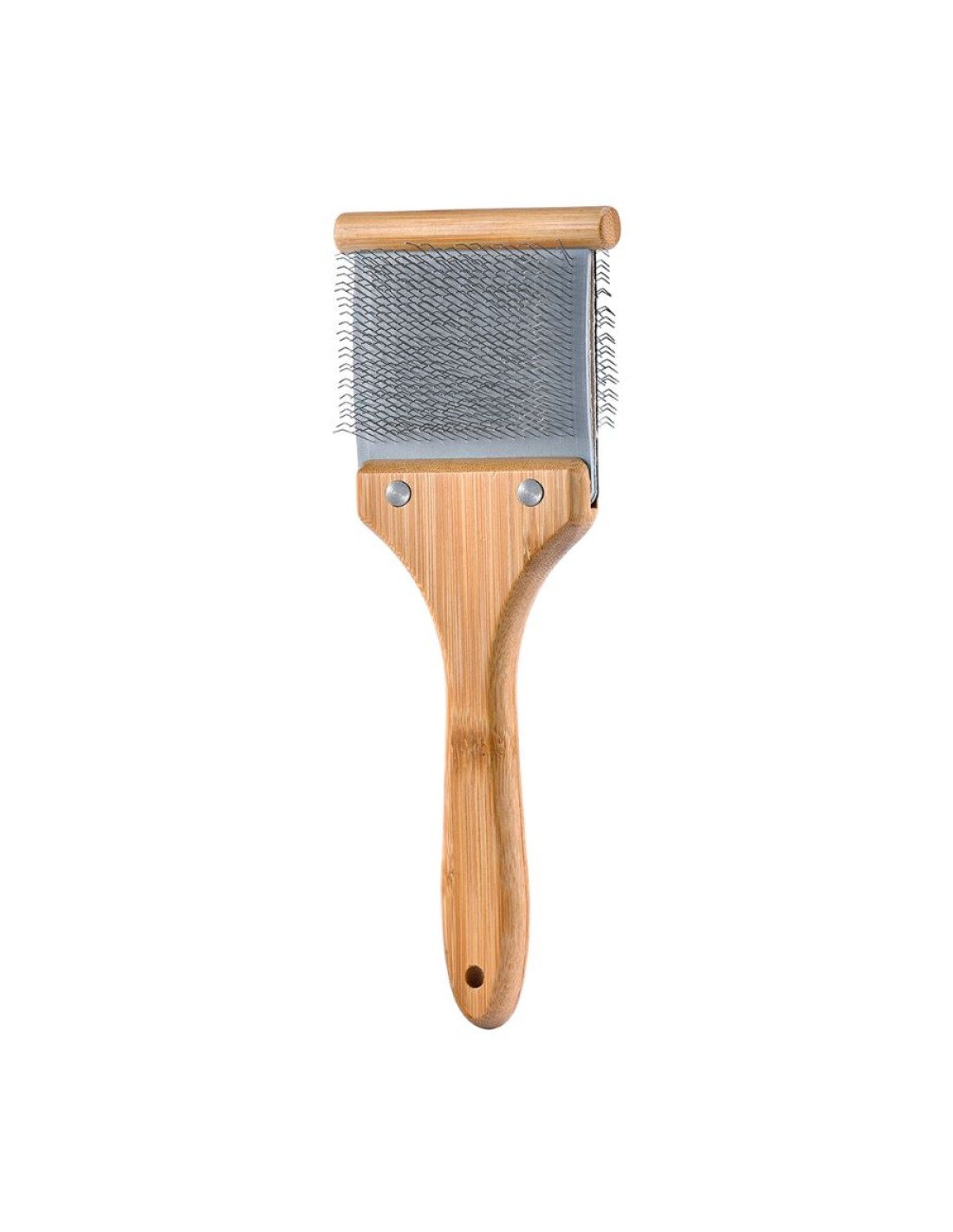 Carda amb capçal flexible gràcies a una placa metàl·lica que uneix les dues cares permetent doblegar-se cap a un costat o un altre per a adaptar-se a la superfície que necessita raspallar. Doble cara de pues, costat gris amb pues més primes i amb un posicionament aleatori ideal per a estirar el pèl i obrir el mantell, cara negra amb pua més gruixuda en forma de filera per a desembolicar.