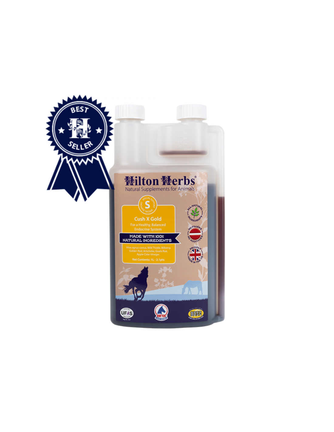 Cush X Gold és un suplement líquid de ràpida absorció que ajuda a equilibrar el sistema endocrí i els nivells hormonals fisiològics de cavalls i ponis de totes les edats. Així mateix, afavoreix el correcte funcionament del sistema circulatori mantenint les funcions urinària i renal normals. Cush X Gold es pot combinar amb el tractament mèdic i és adequat per a aquells propensos a laminitis.