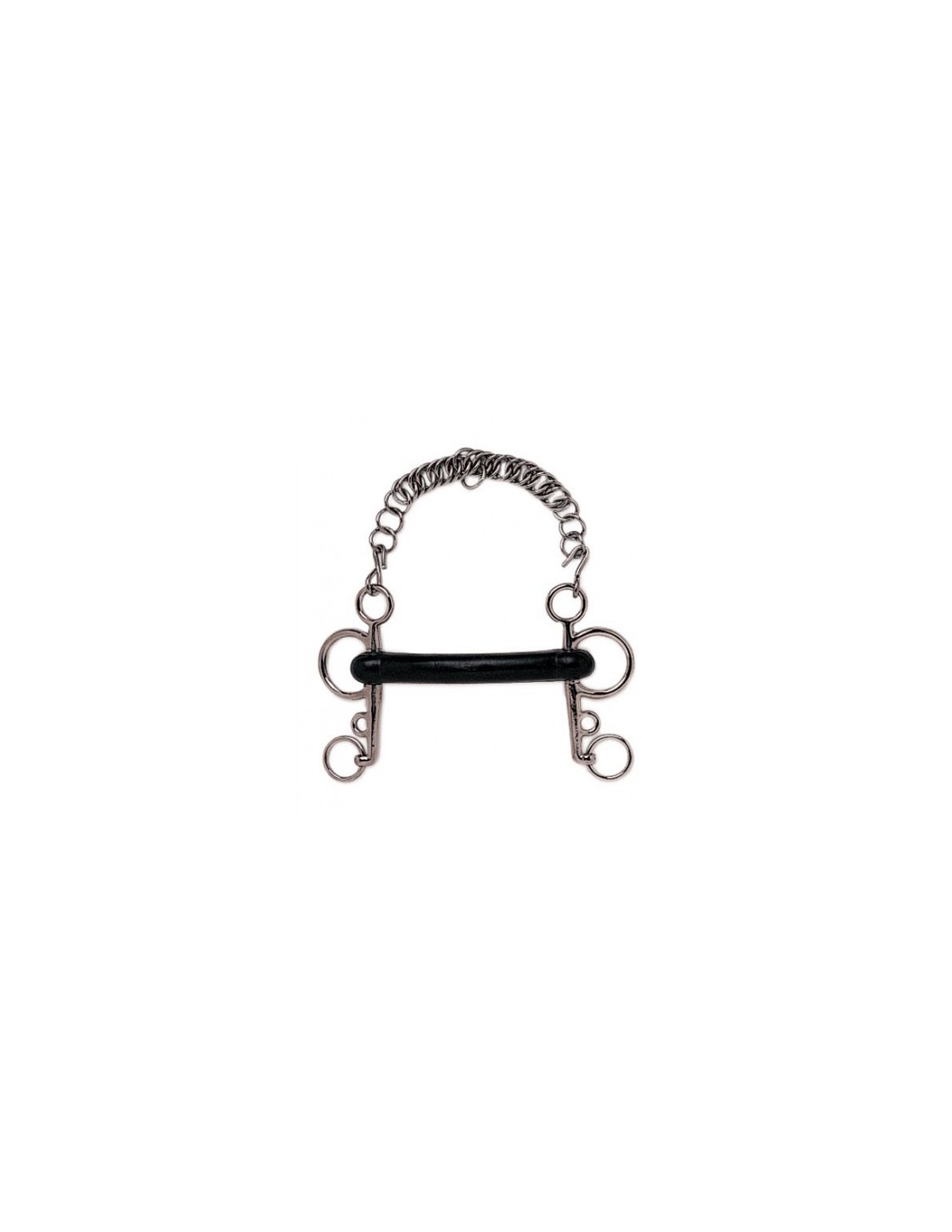 Bocado pelham hecho de acero inoxidable y un cañón de goma flexible con un cable de acero que recorre el interior de la pieza que la endureze y evita que se rompa. Combina la flexibilidad de la goma que favorece la confianza en el contacto y la relajación con un punto de presión por palanca que aumenta el control y la dureza del contacto.