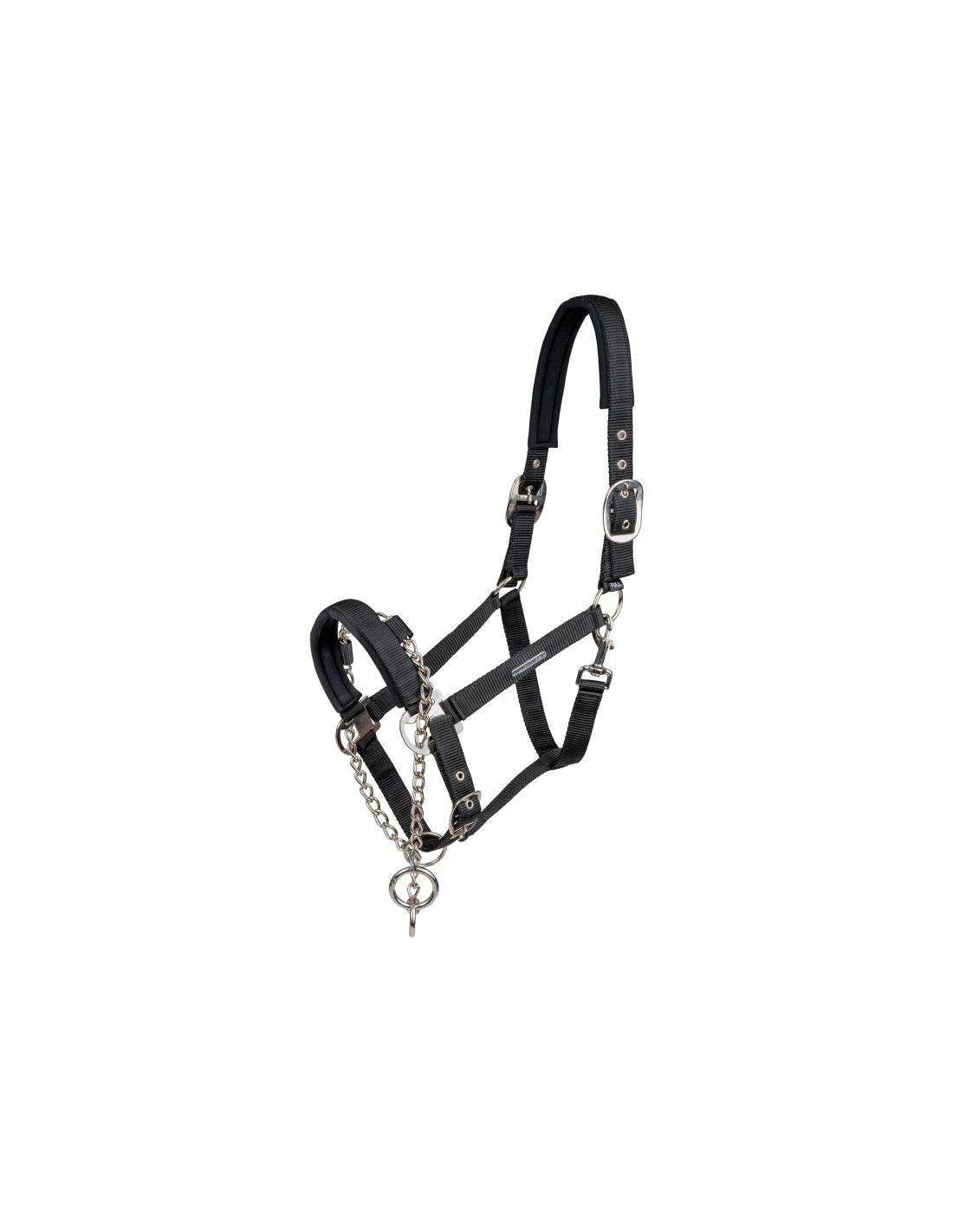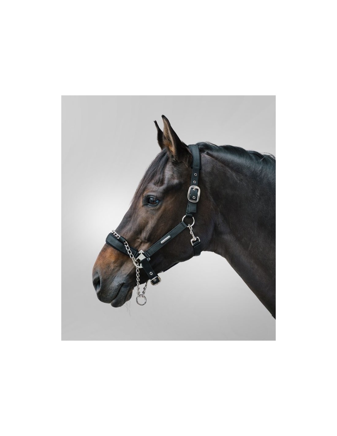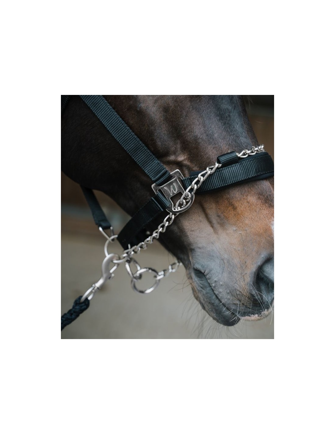 Cabezada de alta calidad con cadena integrada en la muserola. El ramal se puede fijar a la anilla de la cabezada, así como a la anilla de la cadena con efecto reducido o también con efecto fuerte.