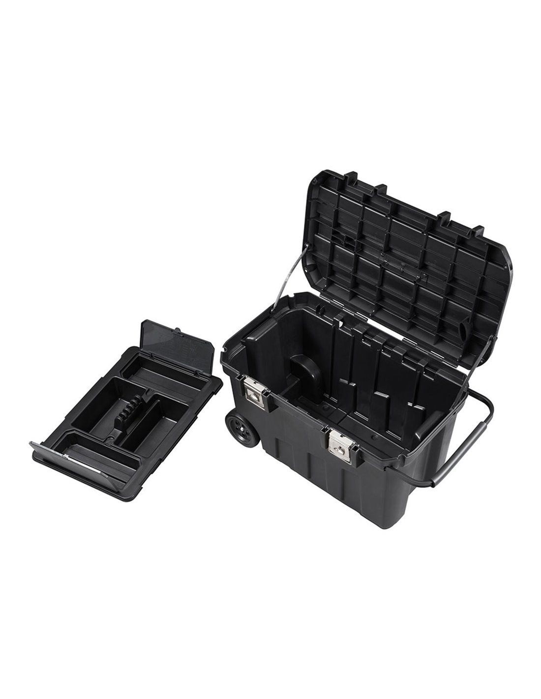 Ruedas muy resistentes de 15,24 cm de grosor. Bandeja extraíble con 2 compartimentos cubiertos para el almacenaje.