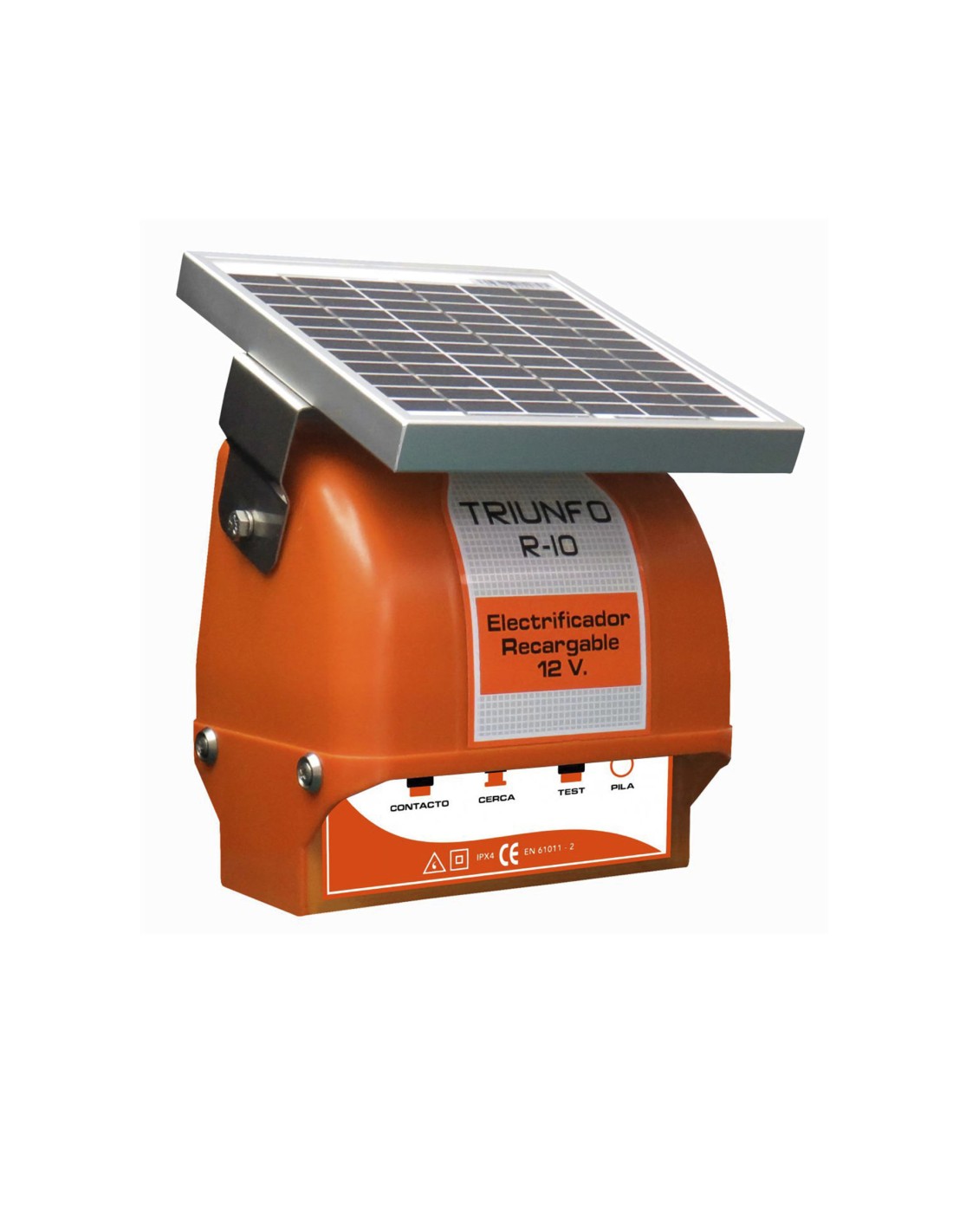 Alimentación: Batería 12 V. 2 A/h. Incluida. Testigo de cargo de batería. Manteniendo la carga por un panel solar de 3 W. fijado en la parte superior. Se suministrará con un cargador por si fuera necesario por falta prolongada de sol. Energía: 0,25 J.
