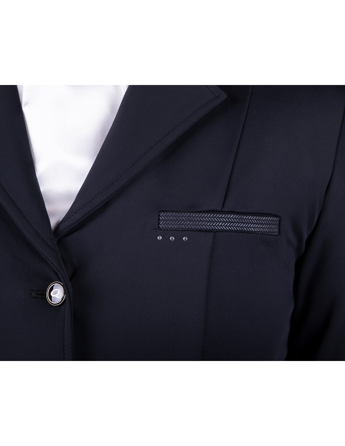 Tres diamantes de imitación en el pecho derecho.