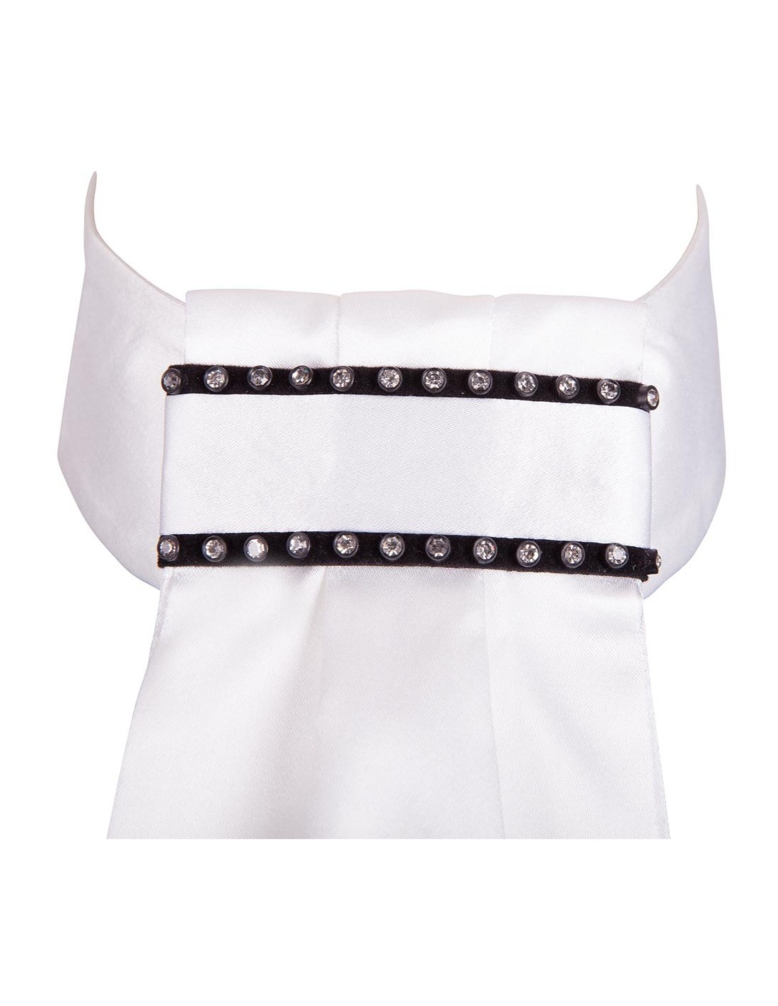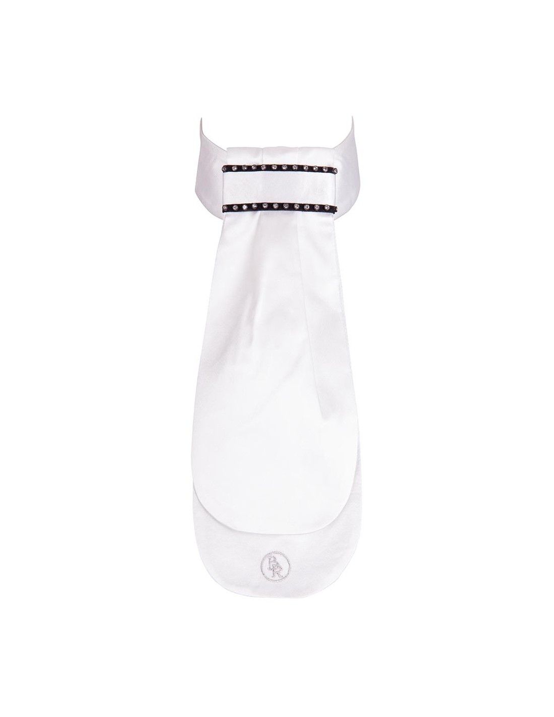 Este plastrón está hecho de raso brillante de poliéster y está decorado con dos rayas negras con diamantes de imitación en el centro de la corbata de stock. La parte inferior de la corbata de stock tiene un bordado BR de color plateado. Es muy práctico, listo para atar y no necesita un alfiler de stock. Se puede abrochar fácilmente alrededor del cuello de la camiseta de competición o de la blusa de competición mediante el cierre de velcro en la parte trasera.