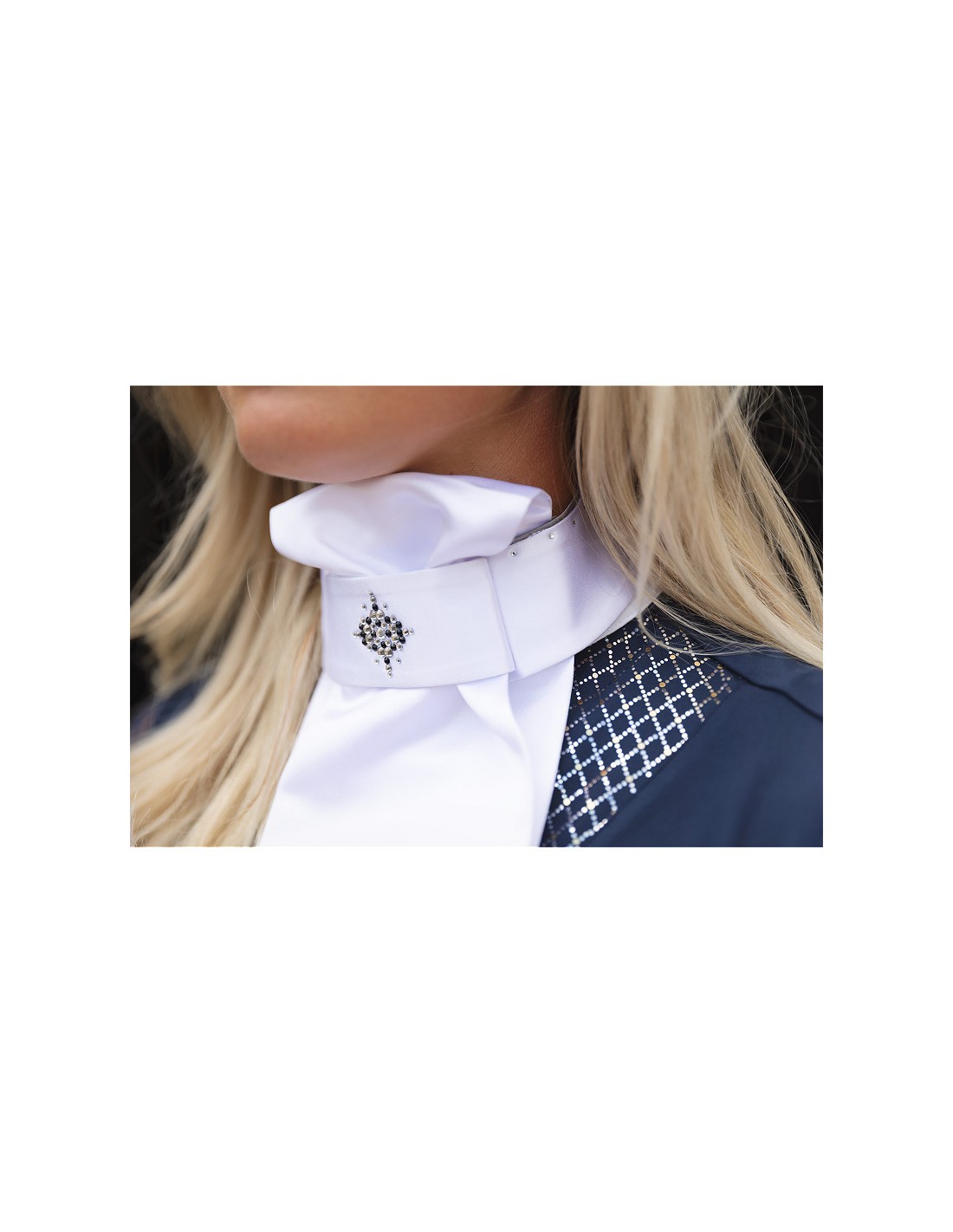 El elegante patrón gráfico de diamantes de imitación contiene diamantes de imitación de diferentes tamaños y colores a juego. El cuello también contiene diamantes de imitación y está rematado con un sutil ribete. La solapa larga y suelta es ajustable y se puede llevar tanto alta como baja.