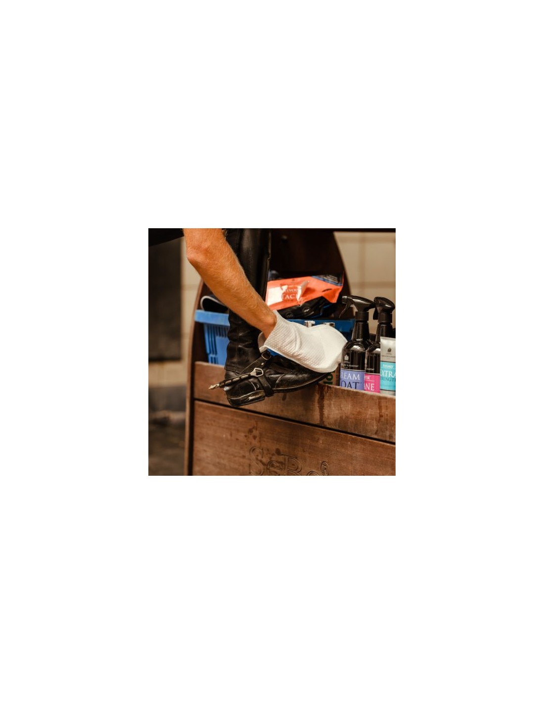 Rápido y práctico, no requiere agua: esencial para llevar y asegurar que tu cuero brille en cualquier evento. También se pueden usar para limpiar botas de montar, bocados y bridas. Enjuaga el guante y limpia el cuarto de aperos al terminar.