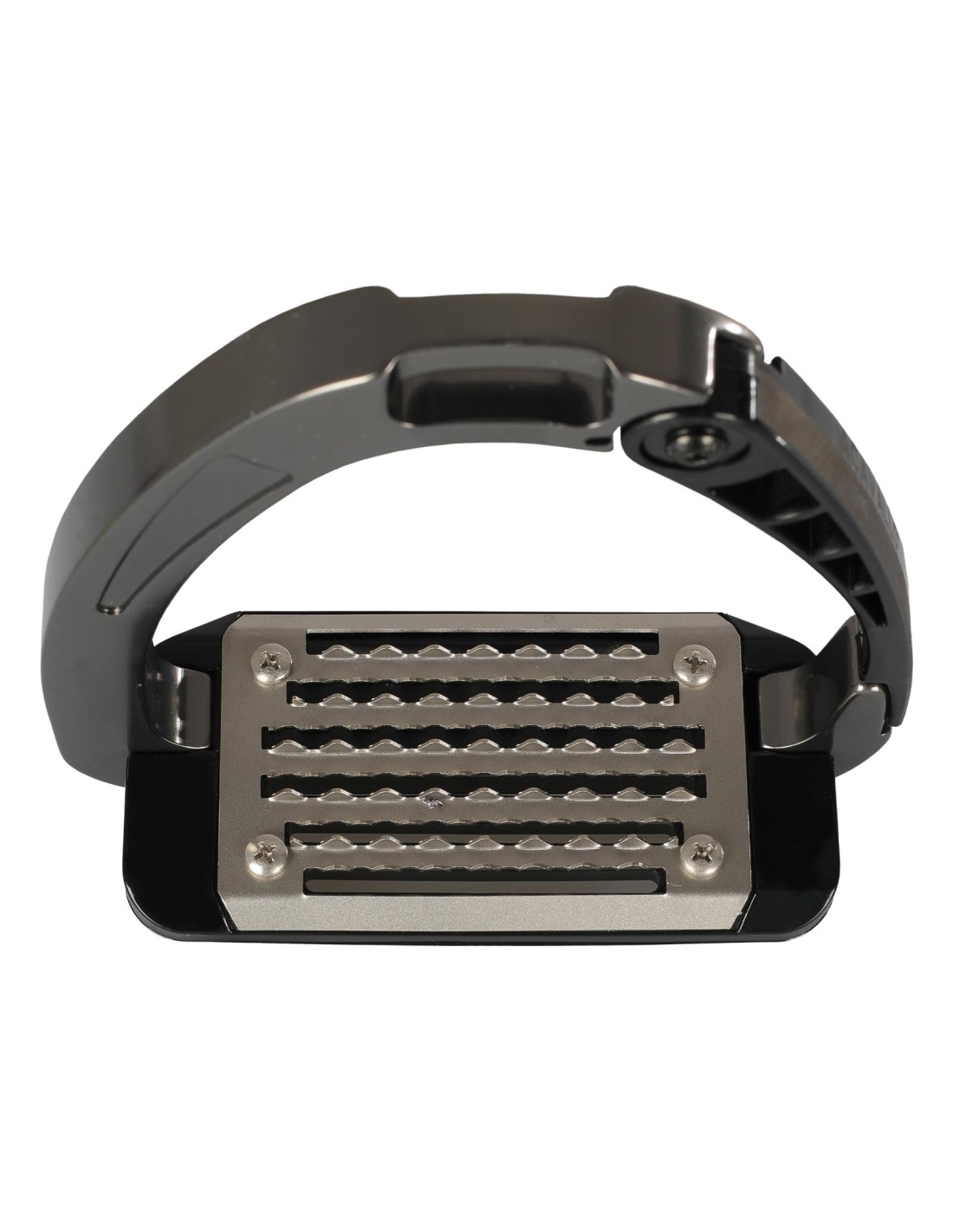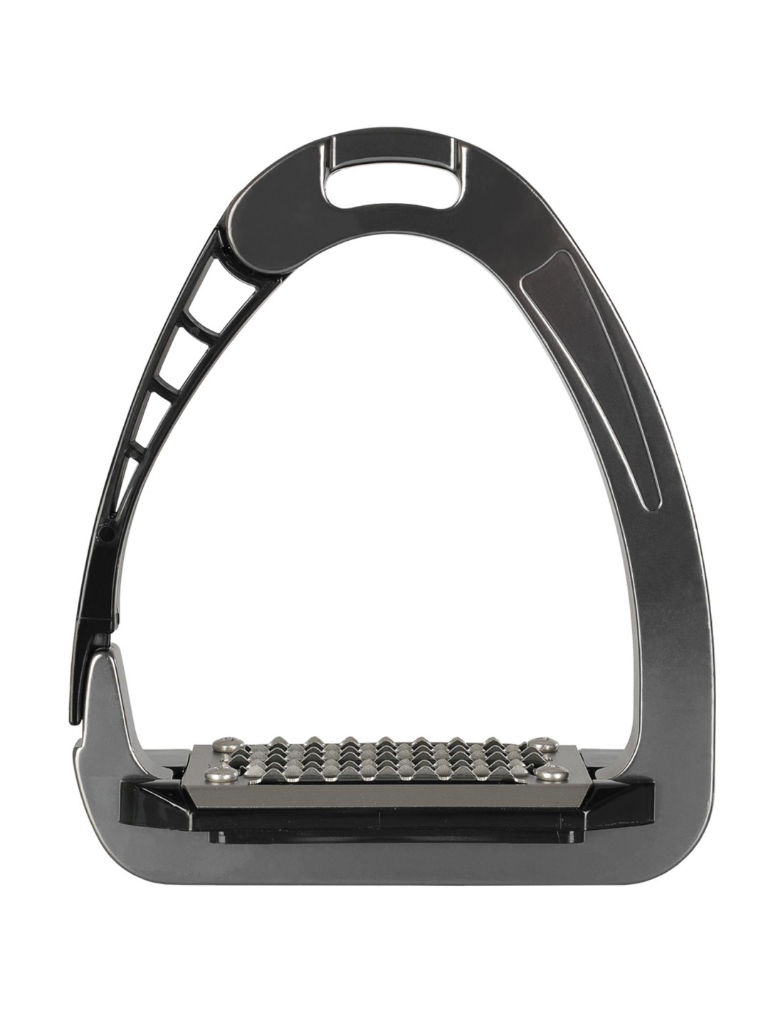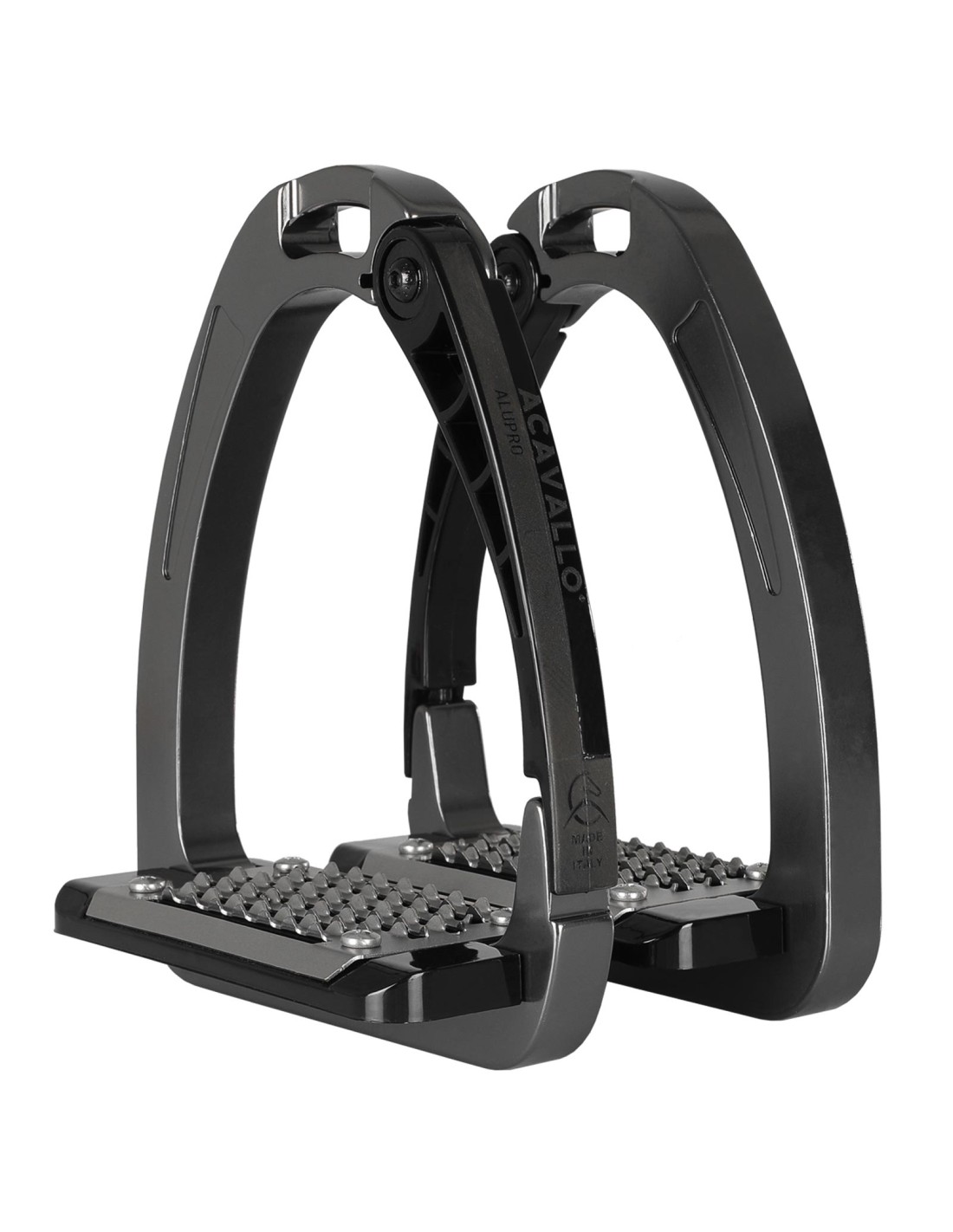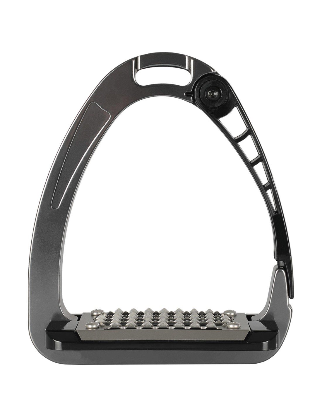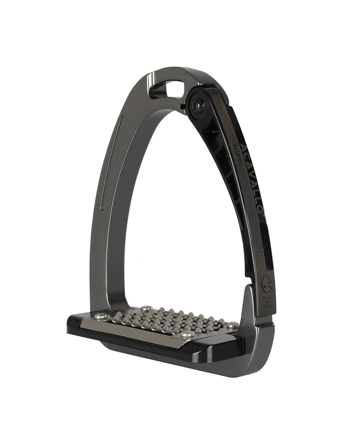 Los estribos Acavallo Arena Alupro se caracterizan por los nuevos estribos patentados de apertura lateral, fruto de varios años de investigación y desarrollo. Combinación de alta tecnología de materiales metálicos y poliméricos, producidos mediante una innovadora técnica de moldeo por inyección patentada. Gracias a su diseño y construcción a base de polímeros flexibles, el estribo transmite una sensación menos rígida y mucho más cómoda al jinete que con los productos convencionales. La parte superior del estribo es de acero inoxidable y se caracteriza por unos largos orificios horizontales que evitan la acumulación de arena y suciedad, para garantizar un agarre óptimo en todas las condiciones; el acero inoxidable también lo protege de la corrosión y, por tanto, garantiza una larga vida útil del producto. La apertura del mecanismo de bloqueo y desbloqueo accionado por tensión se encuentra un centímetro más arriba de la banda de rodadura para garantizar que el pie no se salga lateralmente por error y para evitar que la arena y la suciedad retrasen la acción de apertura del brazo en caso de emergencia.