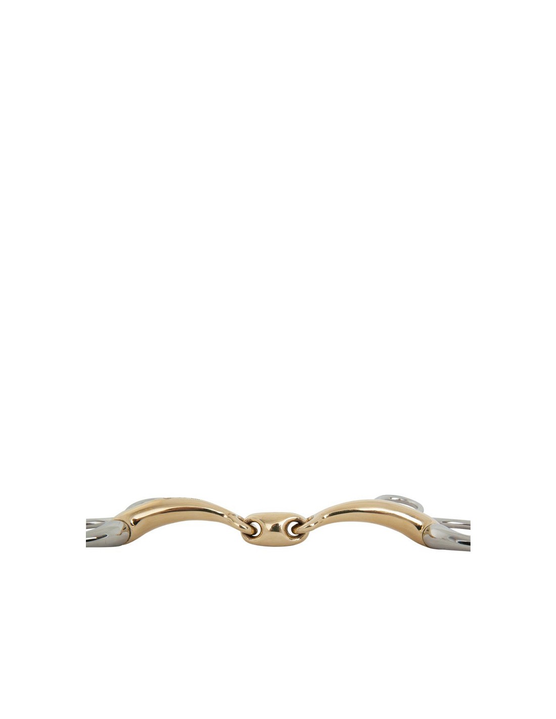El cuprigan es una aleación que consta de un 89% de cobre, un 7% de aluminio, un 3% de hierro y un 1% de zinc. El proceso de oxidación del material le da un olor y un sabor agradables. El diseño anatómico del bocado sigue la forma de la boca del caballo, lo que permite una distribución suave y uniforme de la presión. El diseño, combinado con las propiedades únicas del cuprigan, fomenta el proceso de masticación y la producción de saliva, lo que permite una conexión agradable con la boca sensible del caballo. Los brazos con anilla están girados ligeramente hacia afuera, lo que permite una libertad óptima de la cabeza del caballo.