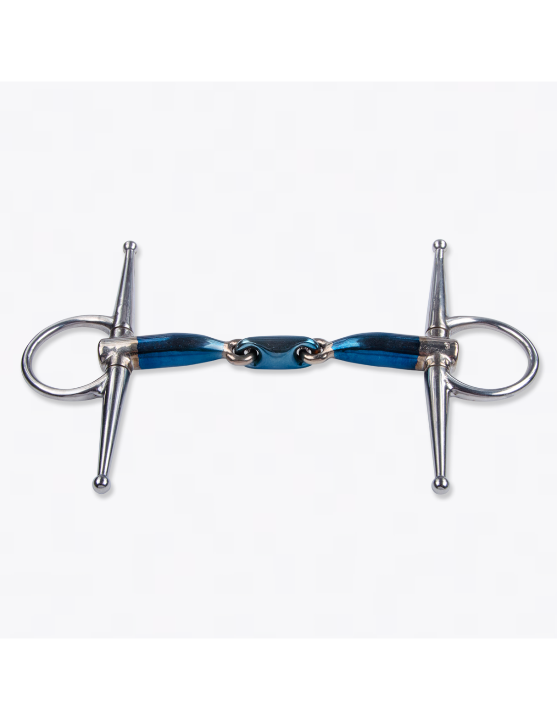 La doble articulación tiene dos puntos de articulación, se adapta mejor a la boca y queda un poco más suelta. Esta embocadura actúa sobre la lengua, las barras y las comisuras de la boca. Tenga cuidado con las mandíbulas inferiores estrechas, ya que los puntos de articulación pueden presionar las barras y causar heridas. En comparación con una embocadura de una sola articulación, esta embocadura actúa más sobre la lengua.