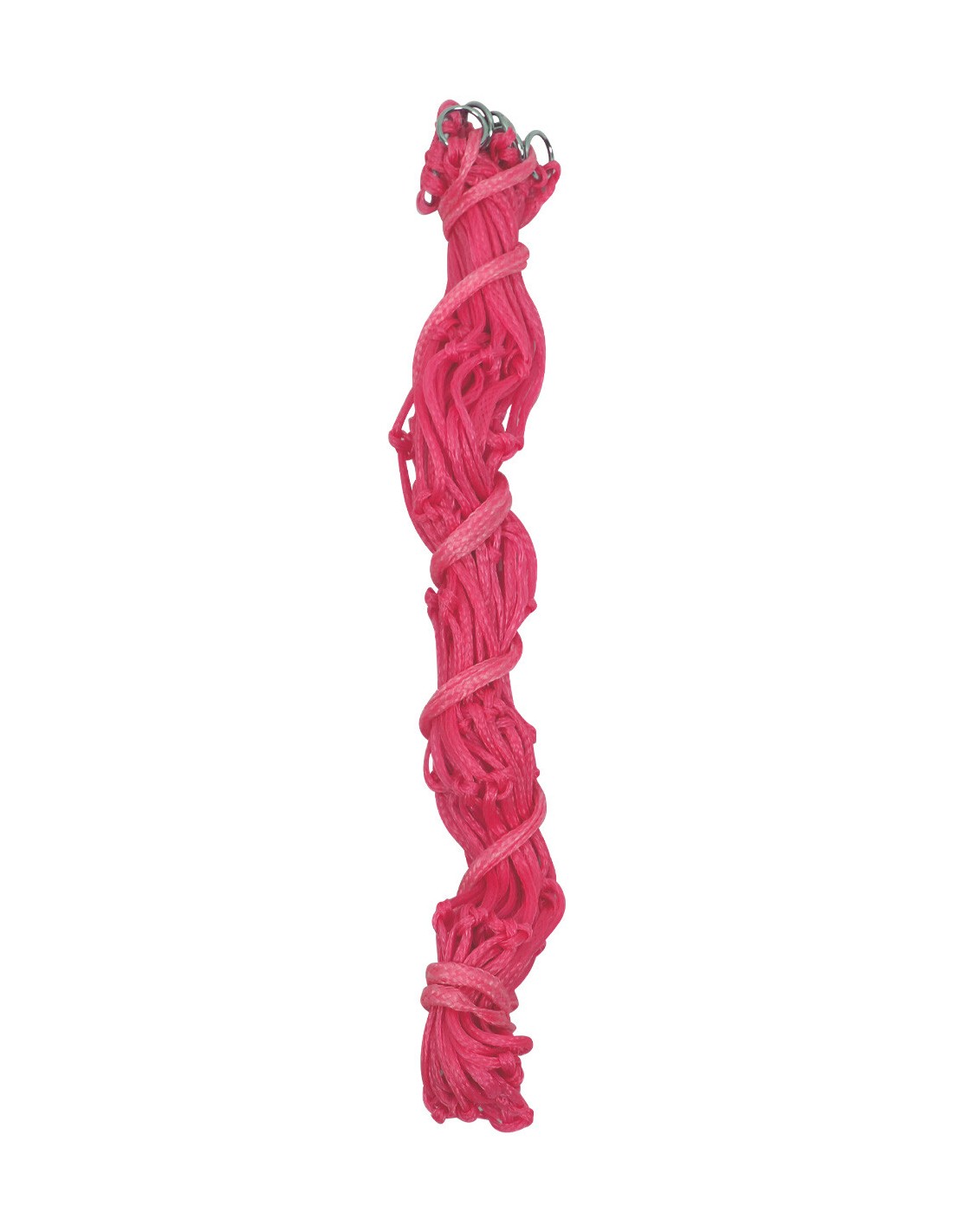 Composición del tejido: 100% nailon.Material de las hebillas: hierro.Red de heno con una malla de aproximadamente 8 cm.Cuenta con 9 anillos en la parte superior.Longitud: 100 cm.Capacidad aproximada: 2-3 kg.