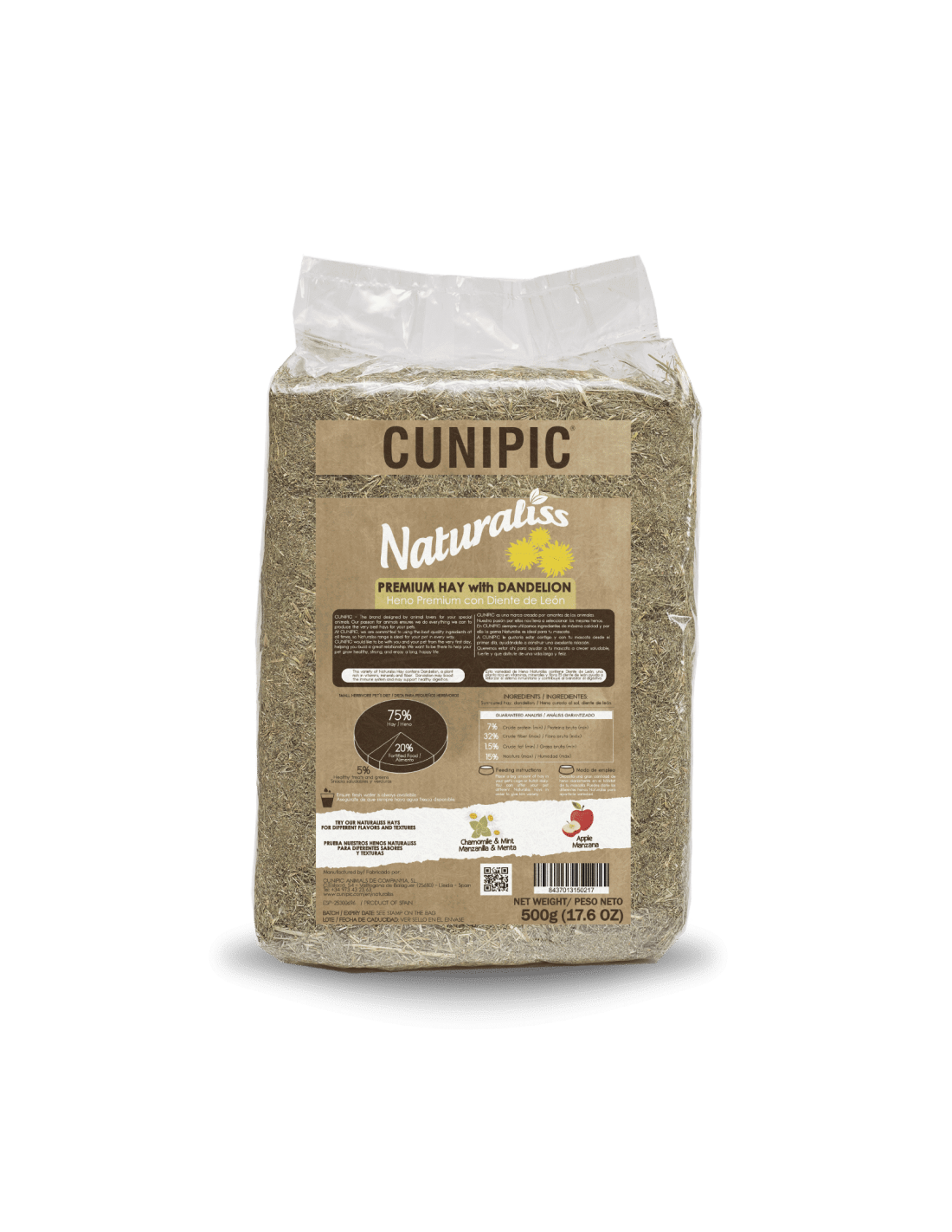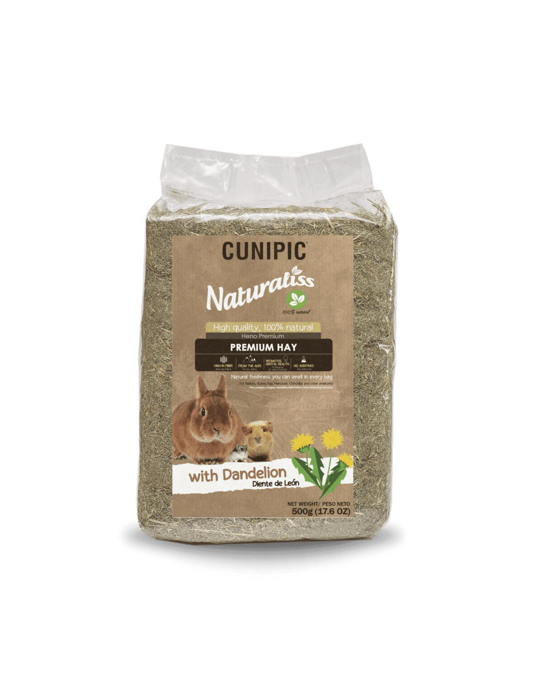 El Heno Premium con Diente de León 500g de Naturaliss, es un producto destinado a roedores y lagomorfos que saca lo mejor de la naturaleza, en prados cercanos a las montañas de los Pirineos, llevando salud y diversión a tu mascota, para que esta crezca sana, fuerte y feliz. Este producto es muy aromático y fresco lo que proporciona a tu mascota un placer para sus sentidos. Este alimento está compuesto por componentes 100% naturales destinados a imitar la dieta que roedores y conejos comen en su hábitat natural.