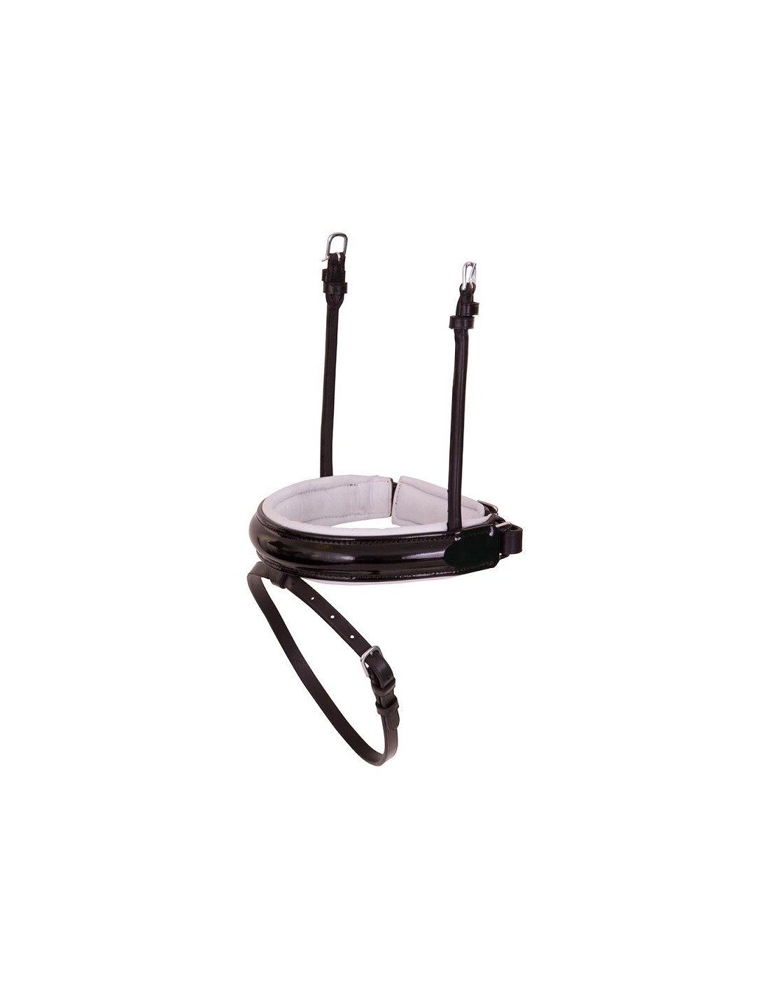 Muserola con ancho extra (± 5 cm) y acolchado suave tiene una elevación redondeada y una almohadilla ancha para la barbilla con acolchado suave. Las carrilleras están hechas de cuero redondo. La muserola tiene un enganche para en forma de V y la hebilla del enganche para la parte trasera y tiene una solapa de protección adicional. Adecuada para bridas con muserola con correas en ambos lados. Con hebillas plateadas brillantes.