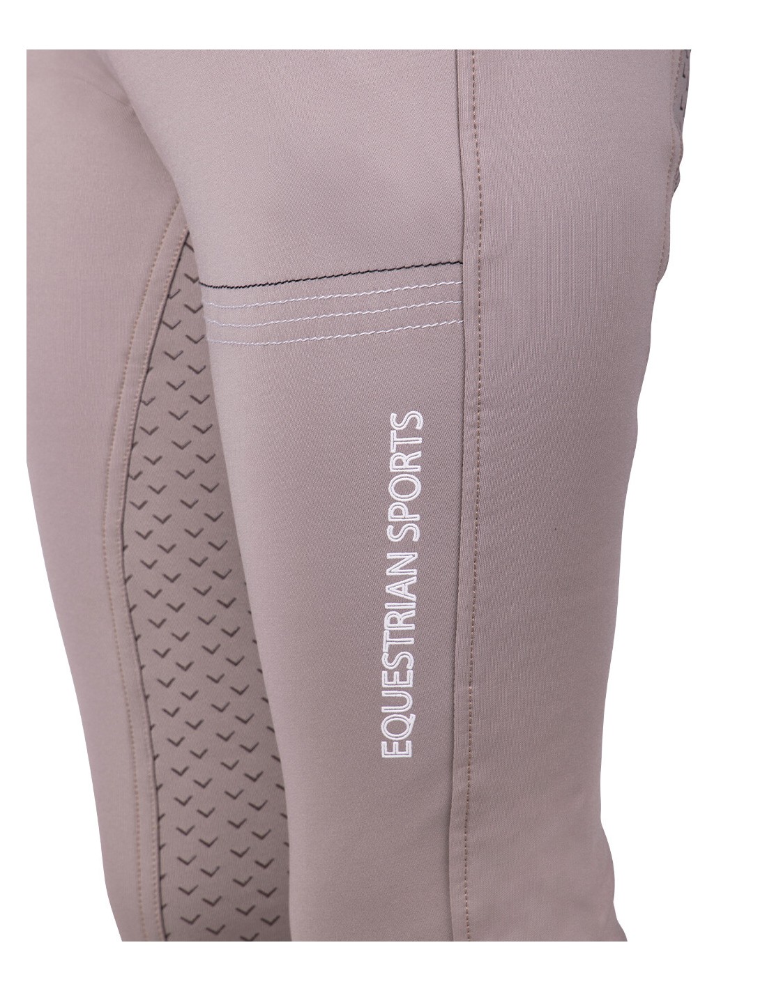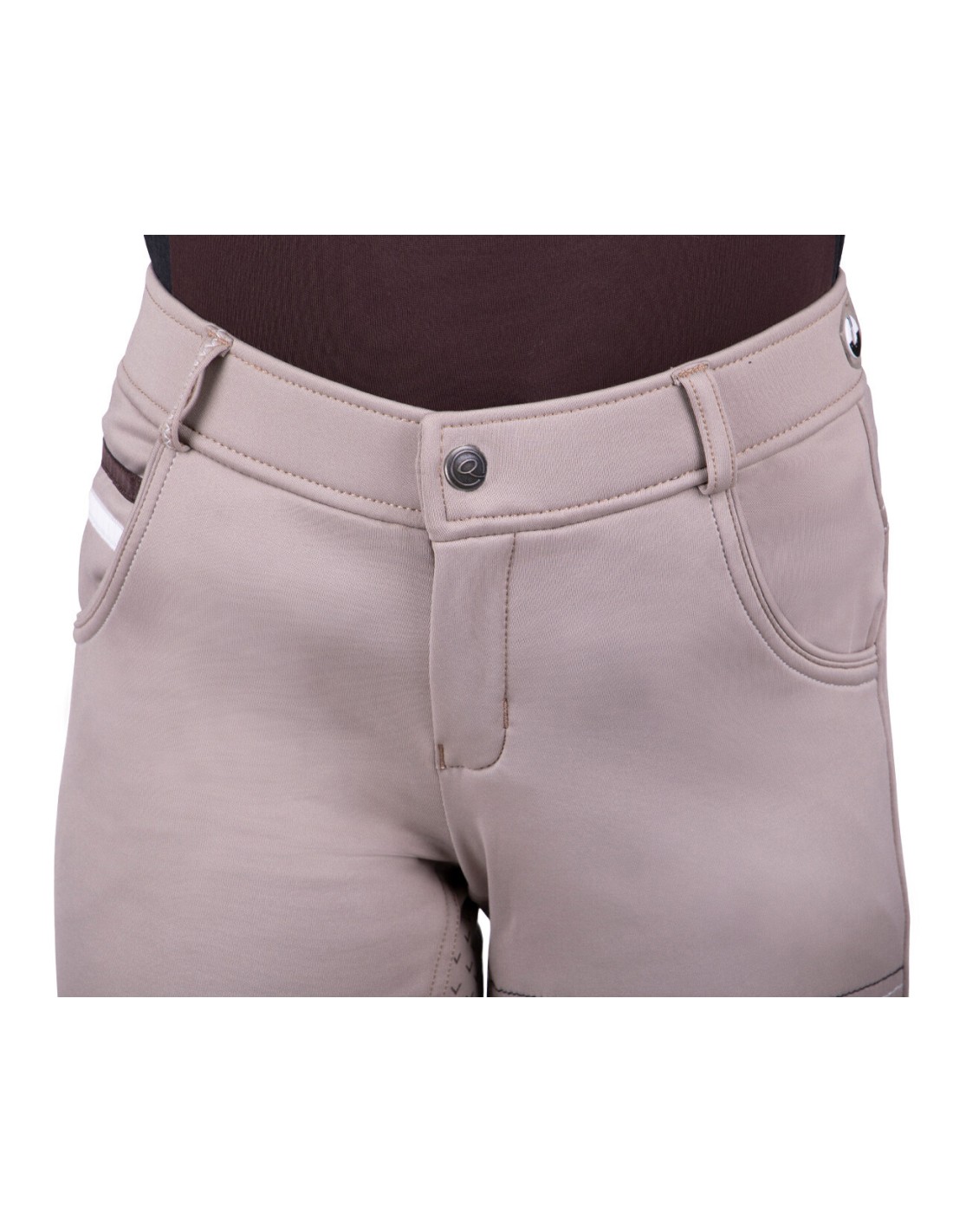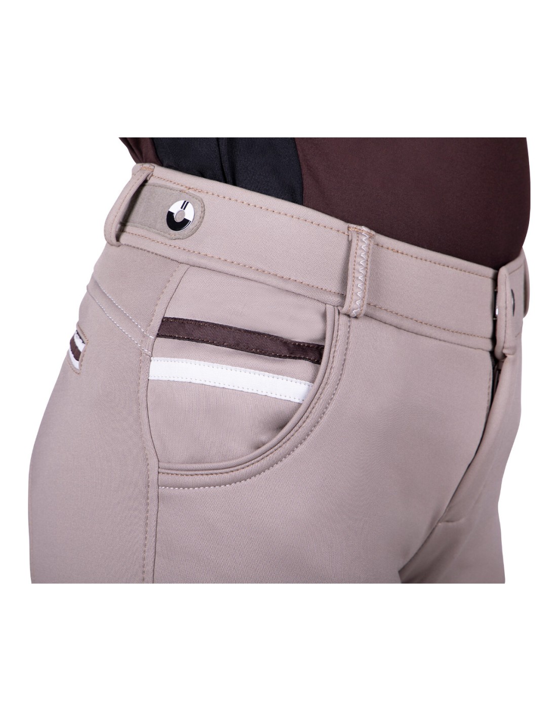 En la parte superior derecha de la pierna, rayas decorativas cosidas con el texto impreso 'Deportes ecuestres'.