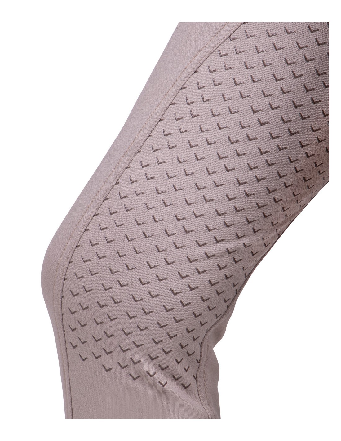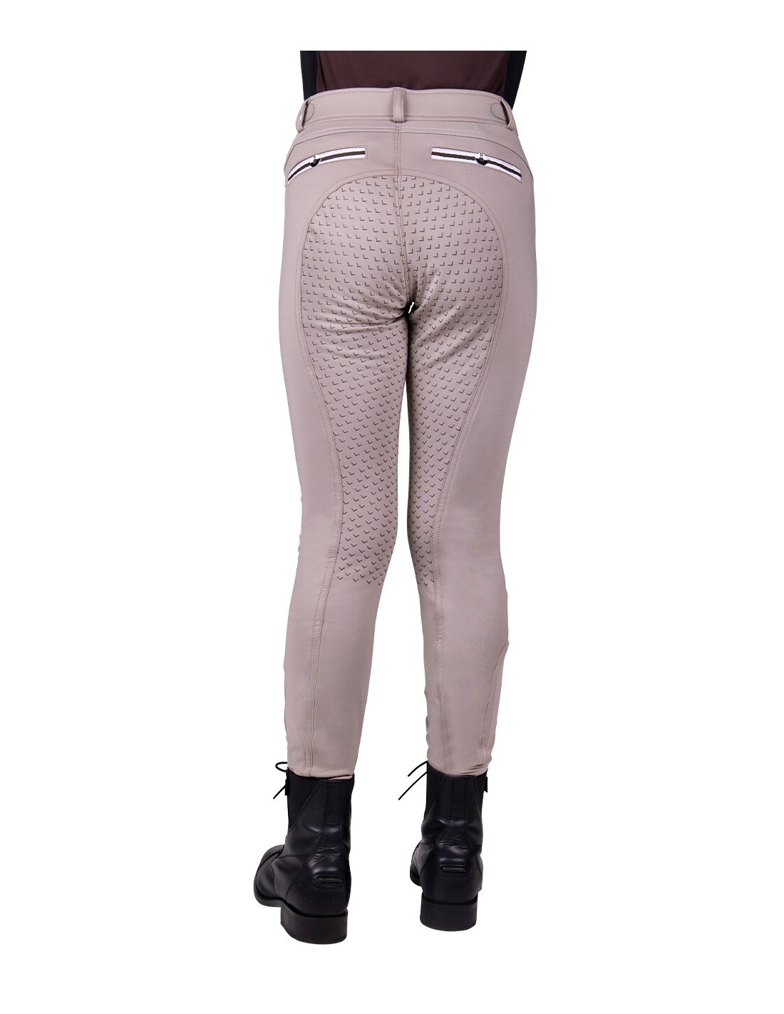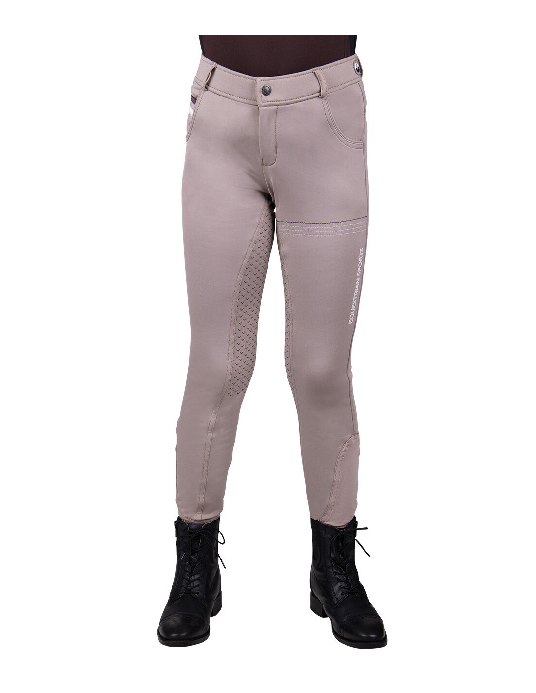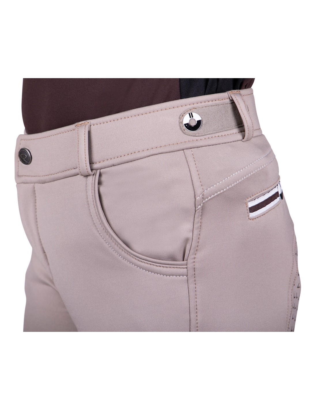 En la parte superior derecha de la pierna, rayas decorativas cosidas con el texto impreso 'Deportes ecuestres'.
