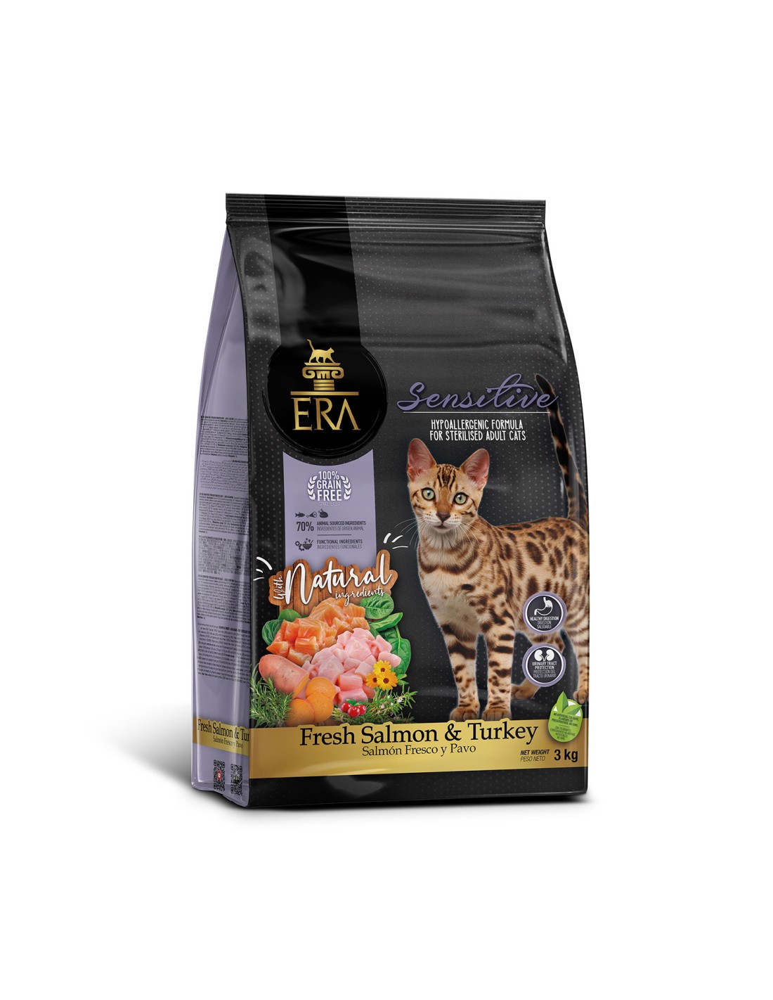 El pienso ERA de Salmón y Pavo es un alimento completo para gatos esterilizados de todas las razaselaborado sin cerealeshaciéndolo ideal para aquellos intolerantes o alérgicos a ciertos ingredientesEste producto incluye probióticos inactivadosantioxidantes naturales, zinc y vitaminasTodos ellos ayudan a reforzar el sistema inmunológicoContiene ingredientes funcionales como la Taurina, plantas y frutos rojos ricos en bioflavonoides, que benefician la protección cardiovascular. Ademásincluye lignocelulosa, fibra soluble que ayuda a mejorar la digestibilidad y contribuye a controlar la formación de bolas de peloAsimismo, a través de la presencia del alga "Ascophyllum nodosum", rica en florotaninos y ácido algínico, se protege la higiene dental de tu gato.