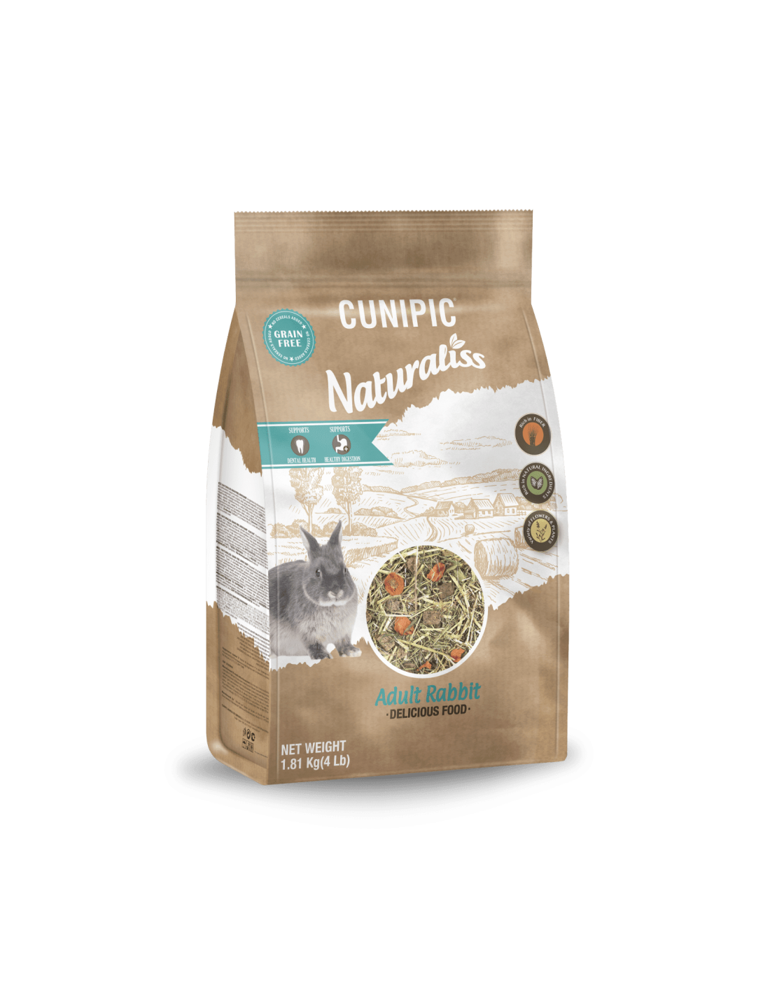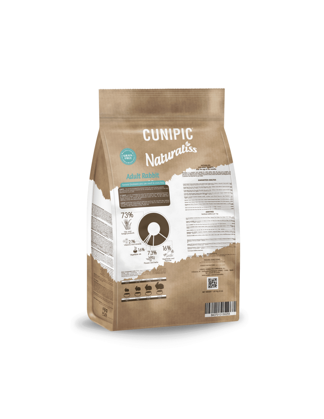 Naturaliss Conejo Adulto 1.81kg, es un pienso destinado a conejos mayores que contiene todos los nutrientes necesarios para que crezca sano, fuerte y feliz. Este es un producto 100 % natural, sin colorantes añadidos y con una alta palatabilidad gracias a la diversidad de plantas y aromas que contiene en cada bolsa. Además, contiene un alto porcentaje en proteína y fibra para favorecer su crecimiento y ayudar a prevenir problemas gastrointestinales.