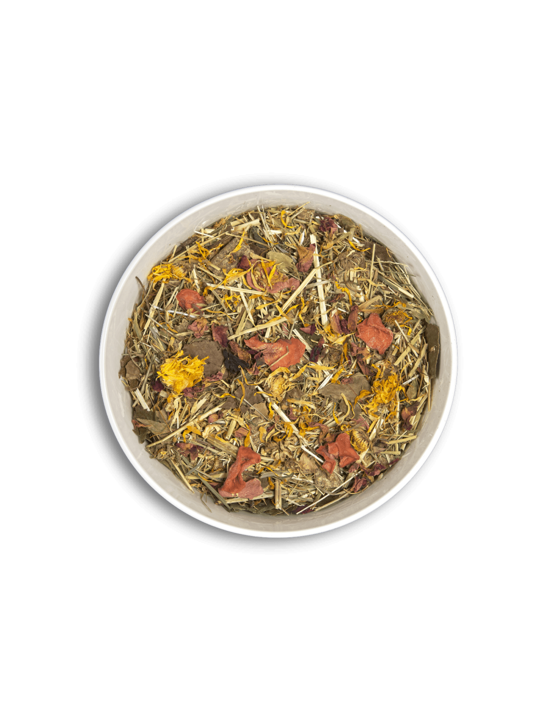 Ingredientes: Heno Timothy, heno de pasto curado al sol, harina de alfalfa deshidratada, productos de forraje, zanahoria deshidratada, ortiga (Urtica Dioica L.), abedul (Betula L.), echinacea (Echinacea), aceite de soja, suplemento vitamínico, sal y carbonato de calcio.