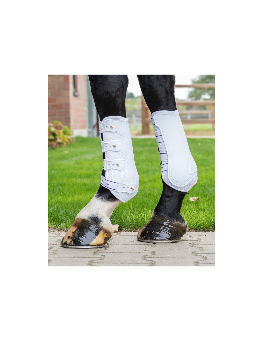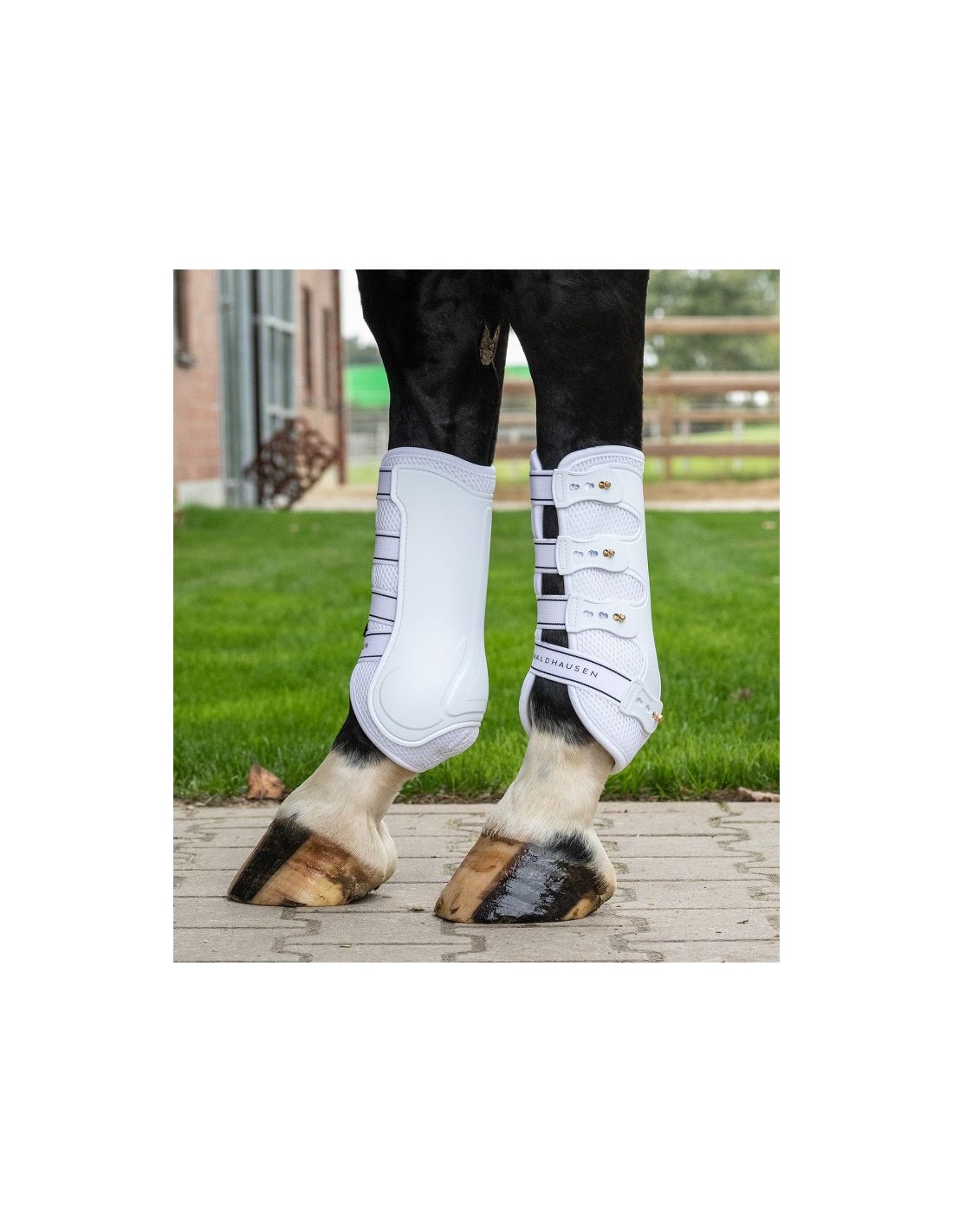 Absorbente de golpes y particularmente permeable al aire por un acolchado de red especial. Regulable en 3 posiciones mediante prácticas correas elásticas que se ajustan perfectamente a la pata del caballo. Set de un par.