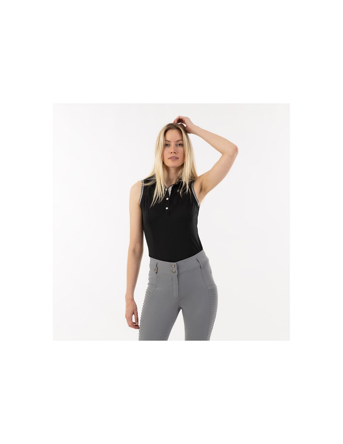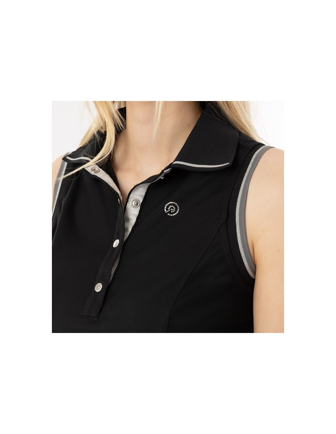 • Logotipo en la parte delantera del pecho en pedrería de cristal.