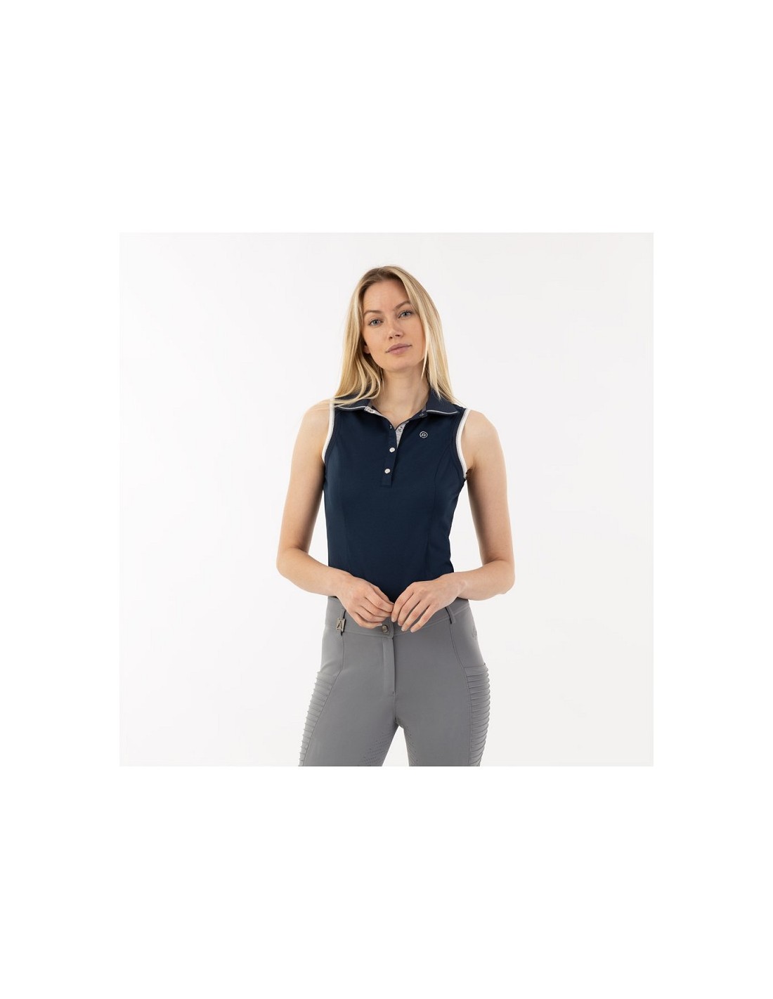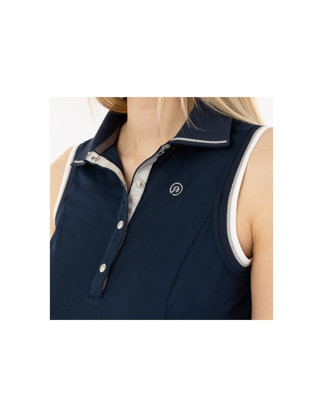 • Logotipo en la parte delantera del pecho en pedrería de cristal.