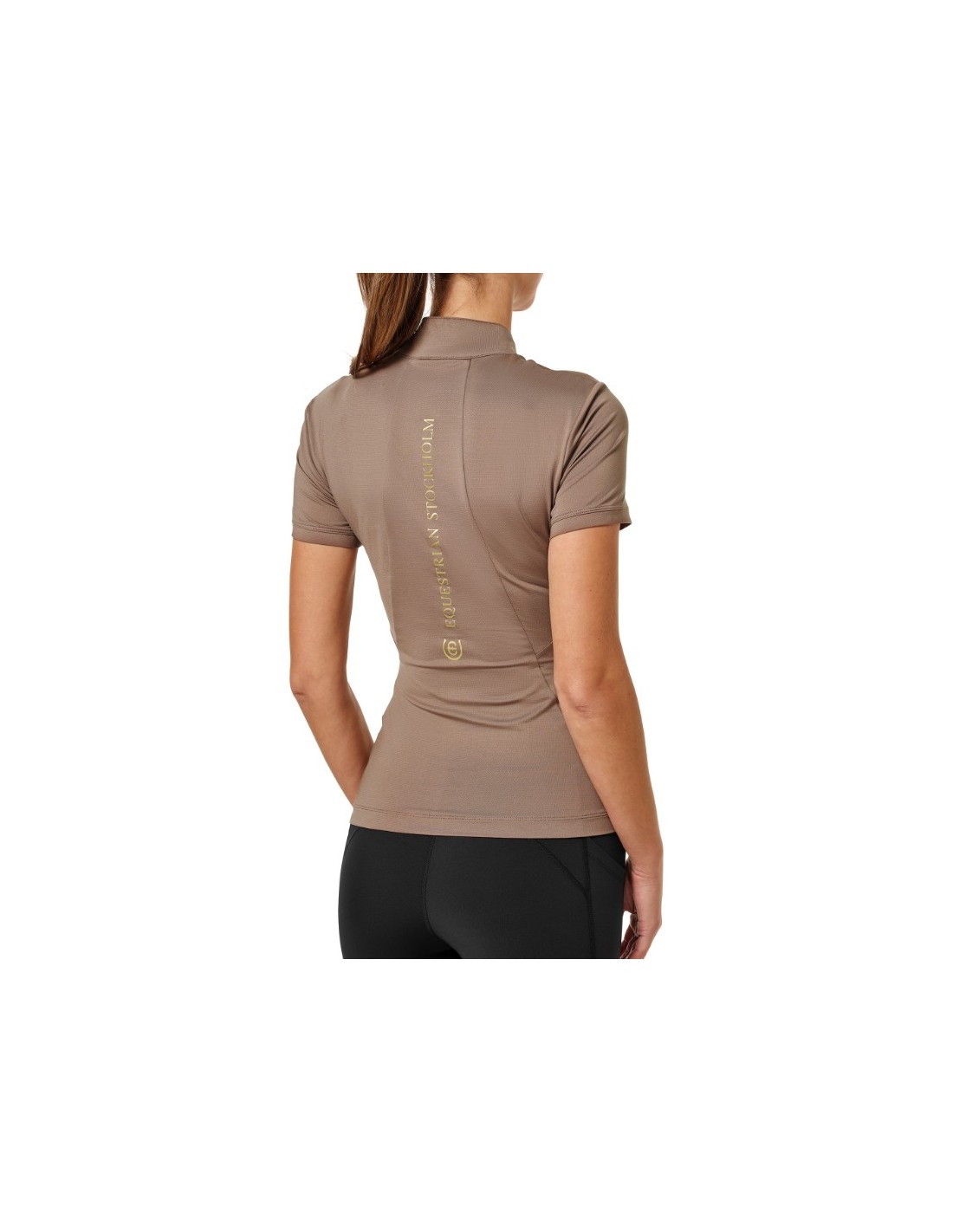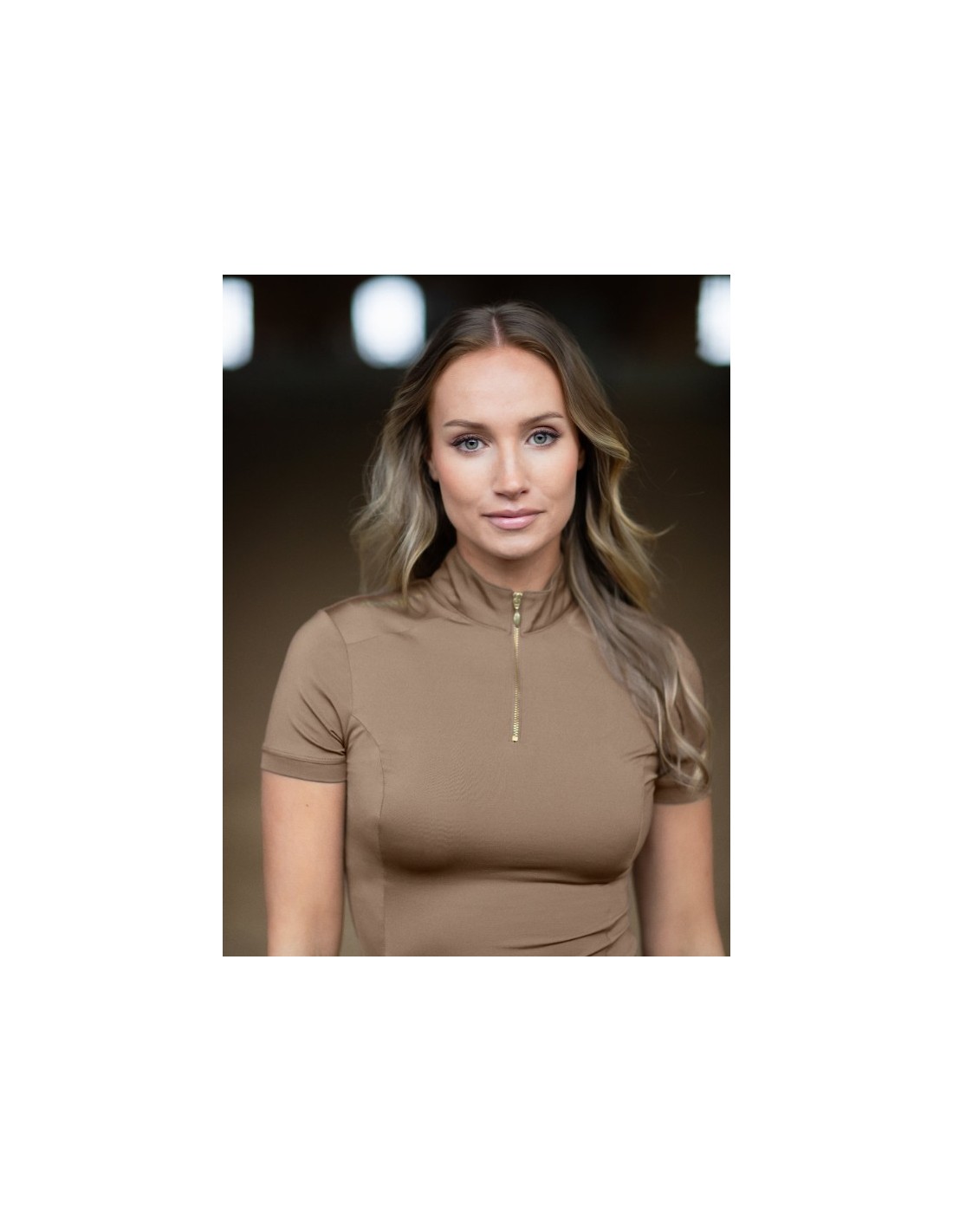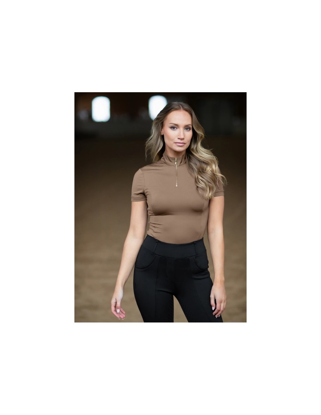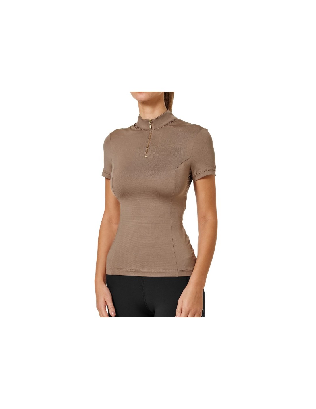 Esta camiseta de equitación presenta un elegante diseño burdeos con una cremallera negra en la parte delantera. Está confeccionada con un material ultrafino de secado rápido, transpirable y con efecto refrescante. Su característica especial es que cuenta con un factor de protección UV 35. Te protege del sol y, con su tacto refrescante, reduce la temperatura de tu piel entre 1 y 2 °C. El material contiene posos de café reciclados, lo que funciona como un inhibidor de olores. Esta función mantiene la camiseta fresca durante más tiempo, lo que significa menos lavados. Mejor para la camiseta, mejor para el planeta.