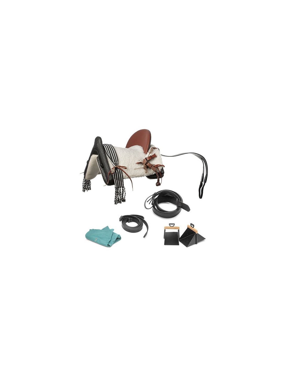 El equipo completo incluye silla, cincha vaquera, baticola, acciones de estribo vaqueras, estribos vaqueros metálicos forrados y acolchados en cuero, porra, manta de lona, baticola, borreguillo sintético, funda de trabajo de lona muy resistente y bolsa de transporte de algodón con asas.