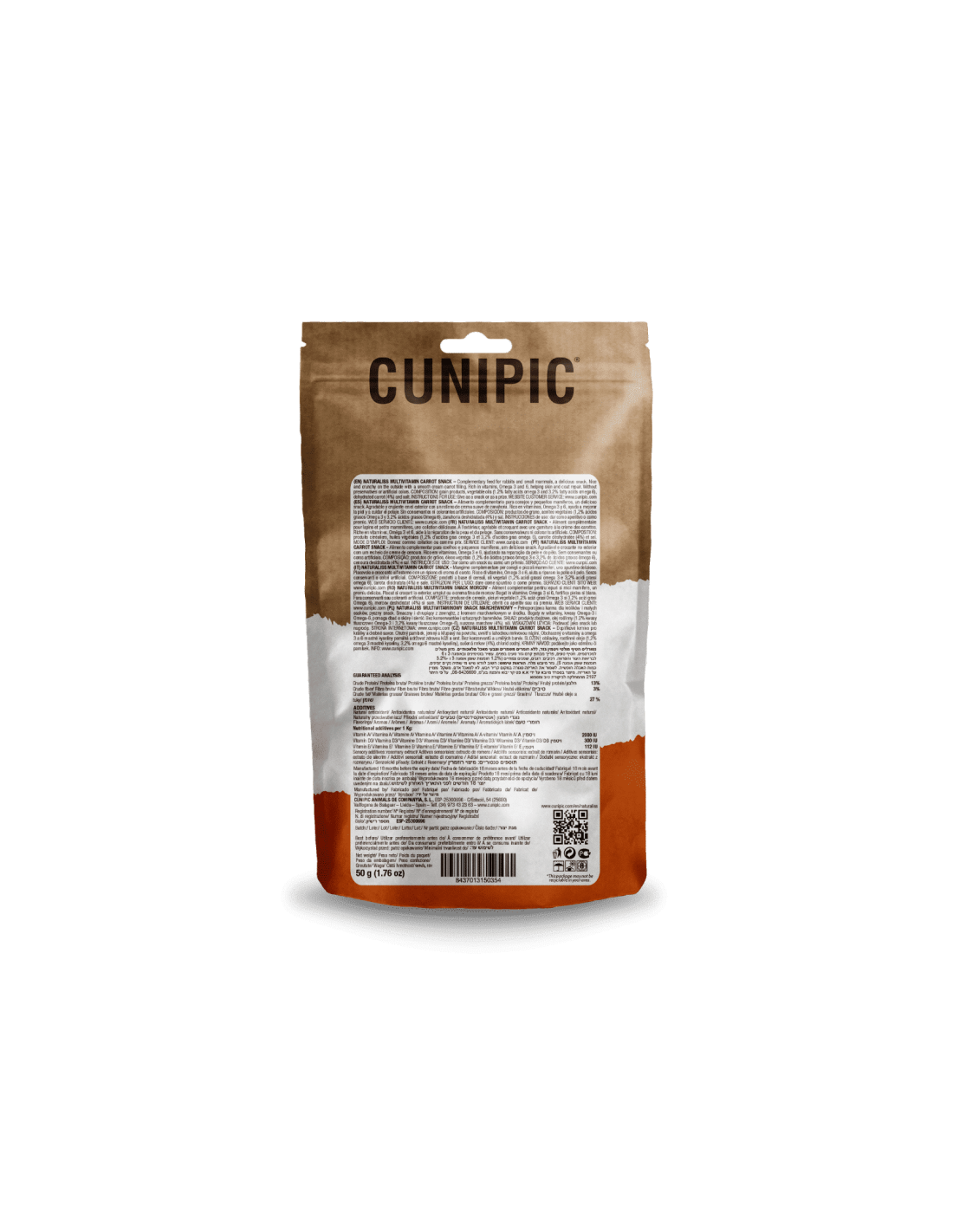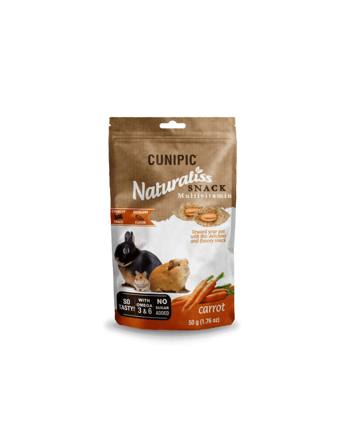 Naturaliss Multivitamin Carrot snack es un delicioso snack de zanahoria para conejos y roedores con el que podrás recompensar las veces que quieras a tu mascota. Este suplemento es un alimento complementario que está relleno de una crema suave de extracto de zanahoria que proporciona al pequeño mamífero todos los beneficios naturales de la zanahoria. Es rico en vitaminas y omega 3 y 6 por lo que ayuda a mejorar la piel y a cuidar el pelaje. Además no contiene ni conservantes ni colorantes artificiales. Es nutritivo, funcional y perfecto para usar como recompensa o simplemente como una rica golosina para dárselo cuando te apetezca porque a él le encantará.