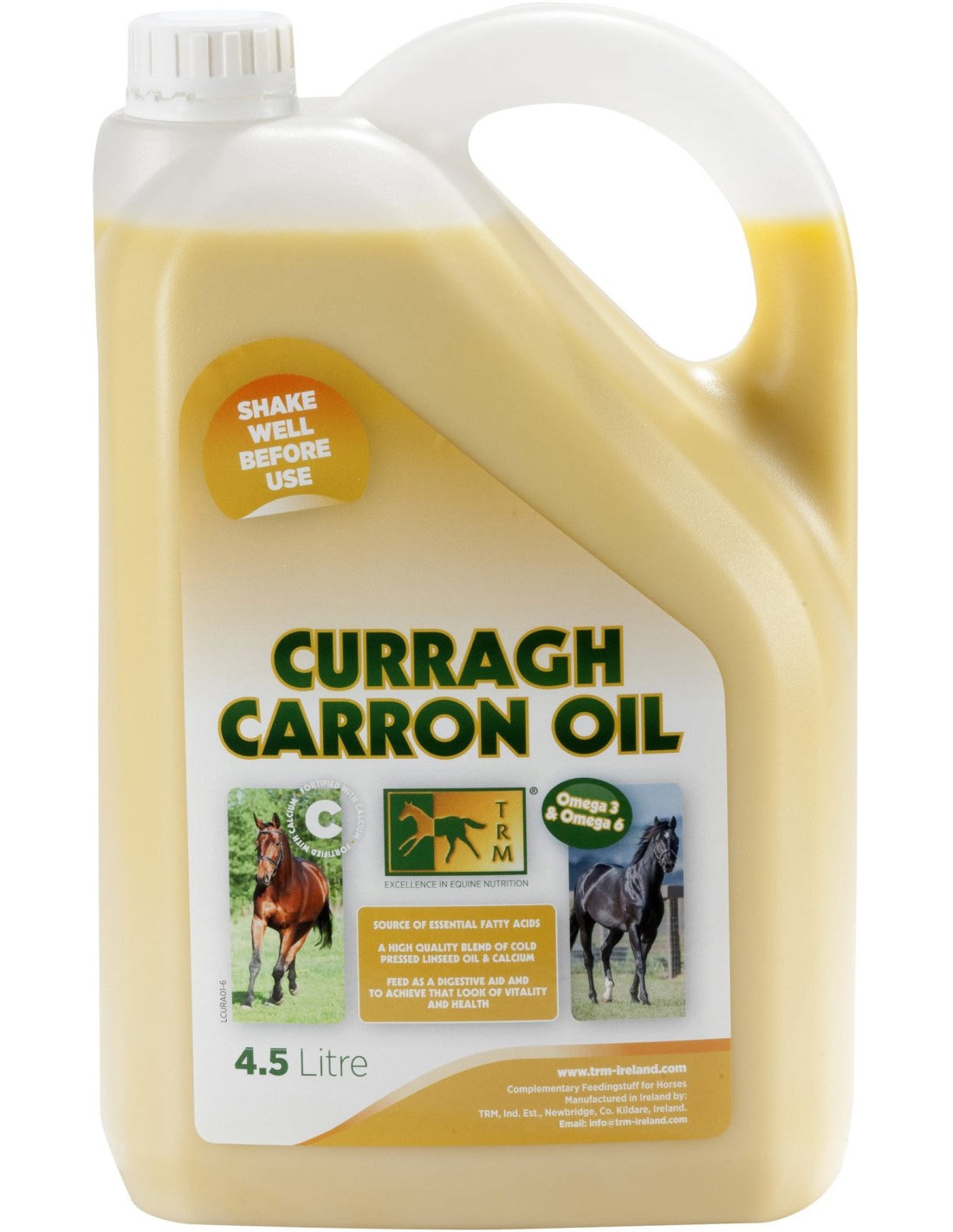 Curragh Carron Oil es un complemento alimentario como ayuda digestiva en los caballos. Proporciona una fuente de ácidos grasos esenciales a partir de la mezcla de aceite de linaza de alta calidad prensado en frío y en caliente. También es un suplemento rico en Omega-3 y Omega-6. Esta recomendado para limpiar y asegurar el vaciado completo del tubo digestivo. De esta manera se evitan cólicos. Además mantiene el manto brillante y liso del caballo.