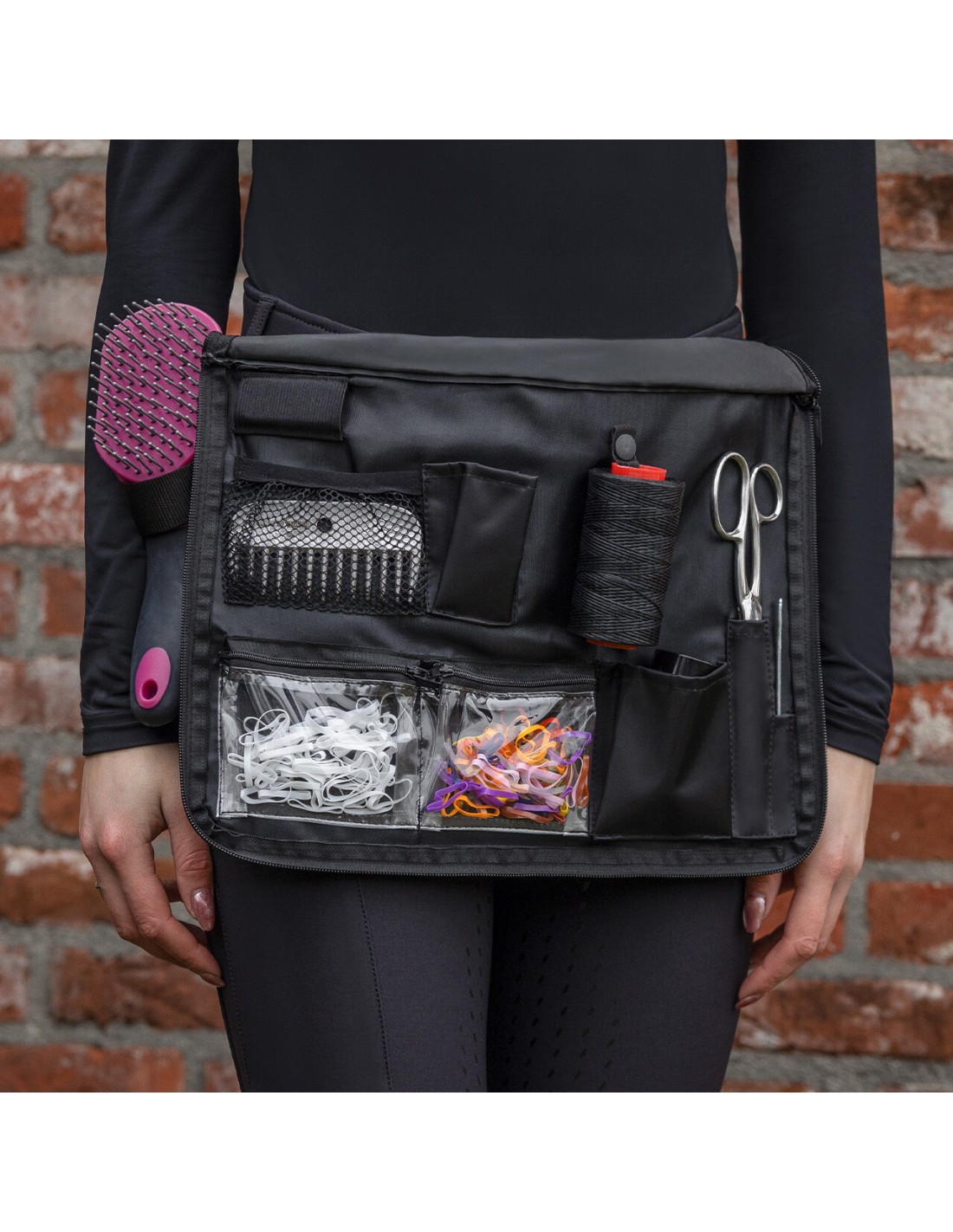 Equipado con presillas para guardar el cepillo para crines y el spray, por ejemplo.
