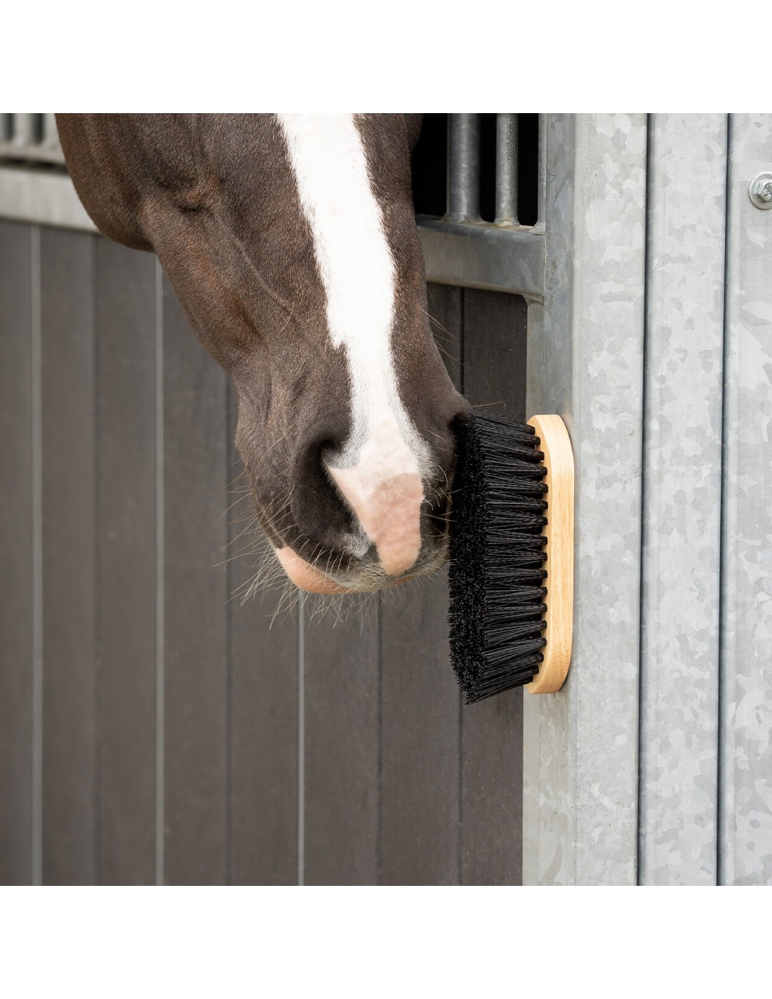 Material: madera, nailon. Cepillo duro para quitar la suciedad. Mango de madera con forma cómoda. El mango tiene un imán para que puedas guardar fácilmente el cepillo contra los barrotes del box, por ejemplo. Con cerdas firmes. Dimensiones del mango: 16 x 6 cm. Longitud de las púas: 4,5 cm.